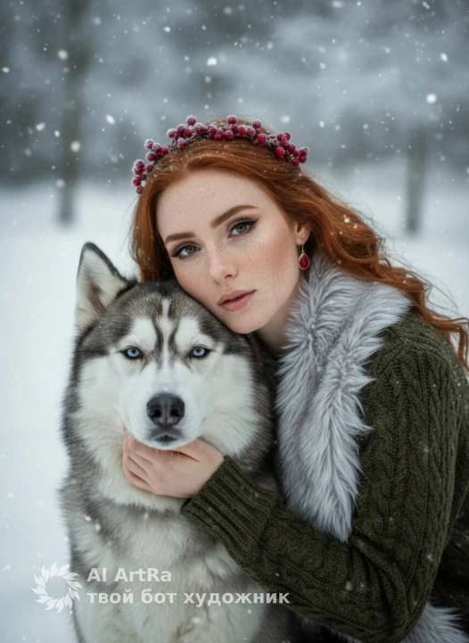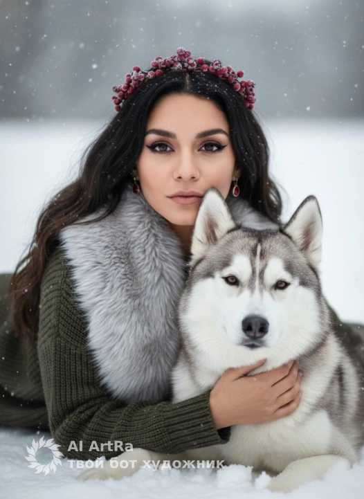 Используйте внешний вид пользователя, референса 1:1 — лицо, кожу, волосы и тело без каких-либо изменений. На изображении — женщина в позе полусидя-полулежа, слегка наклонившаяся вперёд, с рукой, ласково покоющейся на шее сибирского хаски, который смотрит прямо в камеру с выражением спокойной преданности; на голове у женщины — тонкий венок из тёмно-красных ягод, слегка покрытый инеем, на лице — драматичный макияж с чёткими стрелками, подчёркнутыми ресницами и нюдовыми губами, на ушах — маленькие красные серьги-капли; она одета в тёмно-оливковый свитер с широким меховым воротником светло-серого цвета, который мягко обрамляет шею; фон — размытый зимний пейзаж с падающим снегом и белыми сугробами, создающий ощущение холодной, но волшебной атмосферы; освещение мягкое, рассеянное, с лёгким боке, подчёркивающее текстуру меха, снежинок и кожи; композиция — крупный план с низкого ракурса, камера чуть ниже уровня глаз, что придаёт сцене интимность и напряжённость; стиль — высокодетализированная цифровая фотография с элементами художественной обработки, передающая эмоции тепла, доверия и зимней сказки.