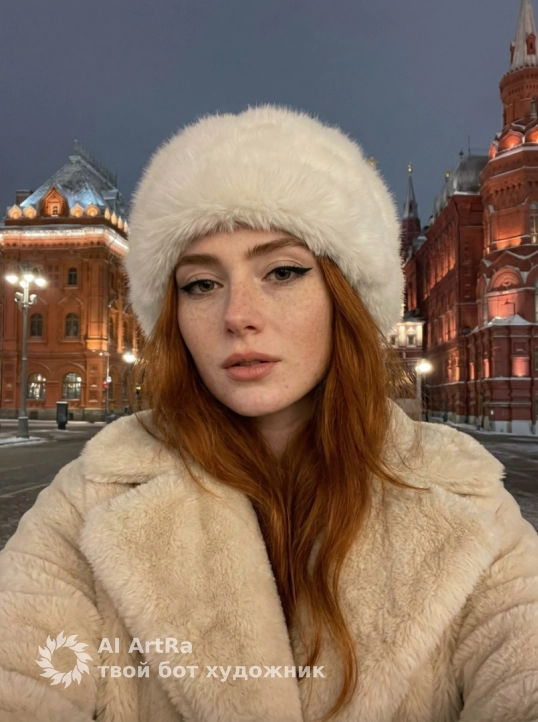 Используйте внешний вид пользователя без каких-либо изменений. Стильная женщина на портрете среднего размера крупным планом, кадр выглядит как селфи, камера смотрит на неё слегка снизу вверх. На ней мягкая, пушистая белая искусственная меховая шапка и уютная кремовая искусственная шуба. Её макияж включает выразительную чёрную подводку для глаз и губы естественного оттенка. Она позирует на открытом воздухе перед кремлем, на карнизах которого видны пятна снега. Действие происходит вечером или ночью под тёмным серо-голубым небом, создающим холодную зимнюю атмосферу. Освещение от уличных фонарей, не слишком яркое, чтобы передавалась атмосфера вечернего селфи. Здание эффектно подсвечено тёплым искусственным светом, отбрасывающим яркие оранжевые и красные тона на фасад. Фокусировка чёткая на объекте, а фон слегка размыт для создания глубины. В целом, изображение обладает эстетикой повседневного селфи с богатыми текстурами и атмосферным освещением. Сохрани внешность пользователя неизмененной.