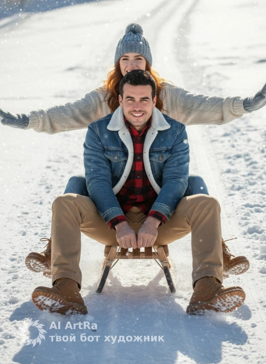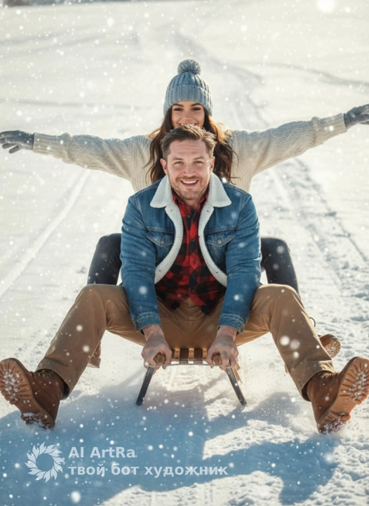 Не меняя внешности людей с фото, на этом динамичном зимнем кадре мужчина и женщина вместе наслаждаются моментом на санках, скользя по искрящемуся снегу под ярким солнечным светом. Мужчина сидит впереди, его тело немного наклонено вперёд, ноги широко расставлены в удобной позе управления санками, на нём светло-коричневые брюки и грубые крепкие ботинки, сочетающиеся с синей джинсовой курткой с белой внутренней отделкой, под которой видна рубашка в крупную красно-чёрную клетку. Его руки крепко держат санки с боков, а лицо освещено прямыми лучами солнца, подчёркивающими лёгкую небритость и добродушную улыбку. За ним женщина сидит, обнимая парня и распростёршимися в стороны руками создавая ощущение свободы и радости; она одета в светлый тёплый свитер с крупной вязкой, такой же серо-голубой вязаный шапке с помпоном и перчатках, которые дополняют её комфортный зимний образ. Тёмные волосы женщины свободно спадают на плечи, эффектно контрастируя с мягкой светлой тканью её одежды. На заднем плане размытая, но ясная белоснежная панорама, наполненная мерцающими снежинками, летящими в воздухе, придаёт кадру сказочную атмосферу праздника и веселья. Свет падает сверху и справа, создавая яркие блики на снежной поверхности и отбрасывая мягкие тени, добавляя глубину и живость композиции, которая выполнена с кинематографической чёткостью и насыщенной цветовой палитрой, подчёркивающей тёплые отношения и энергичный момент, фотореалистичное изображение, высокая текстурная детализация, высокое качество, разрешение 8K.