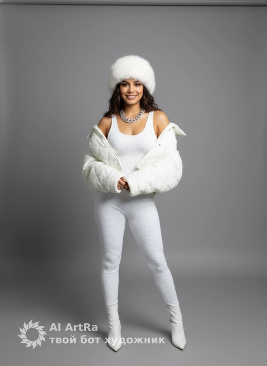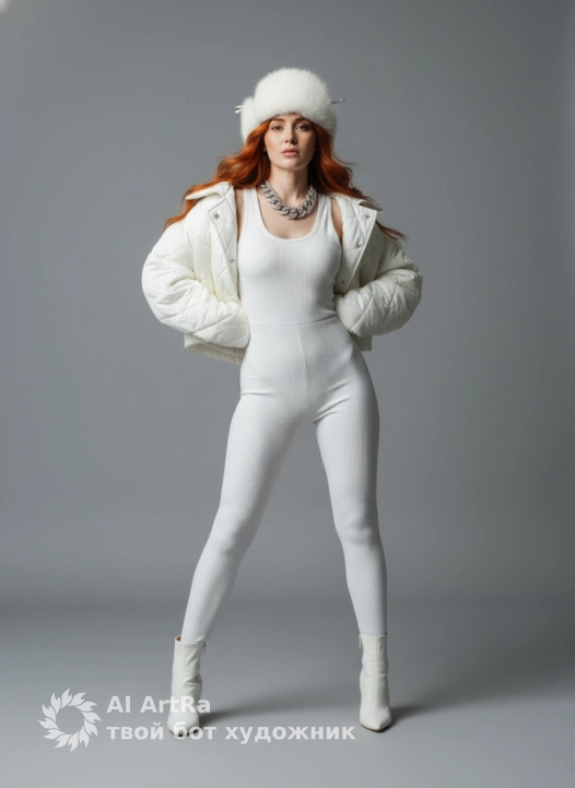 Full-length studio portrait of a woman, standing portrait, confidently looking into the camera. She wears a distinctly ribbed sports jumpsuit white tracksuit , a prominently quilted, oversized white cropped jacket draped over her shoulders . Completing her look are a white fur hat with earflaps (ushanka style) with lapels, white pointed ankle boots, and a thick silver diamond necklace. The setting is a minimalist studio with a gray cyclorama, illuminated by bright, clean high-key lighting, evenly distributed soft diffused light, and minimal shadows. The image is photorealistic, highly detailed, sharp focus, 8K resolution.