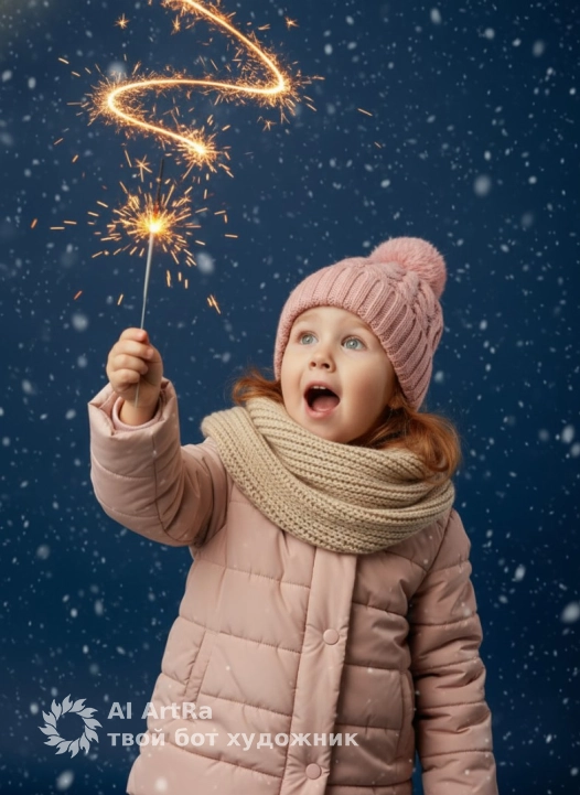 Используйте внешний вид пользователя, референса 1:1 — лицо, кожу, волосы и тело без каких-либо изменений. Девочка в уютной зимней одежде — розовой вязаной шапке с помпоном и объемным бежевым вязаным шарфом, надетым поверх светло-розовой пуховой куртки с текстурой стёганого материала — держит в поднятой правой руке горящий бенгальский огонёк, чьи искры создают динамичный световой след на тёмно-синем фоне, усыпанном мягкими белыми точками, имитирующими падающий снег; её поза — слегка наклонённая вперёд, с открытым ртом и сияющим взглядом, направленным вверх на искры, передаёт восторг и волшебство момента; освещение мягкое, направленное спереди и сверху, подчёркивает блеск искр и тёплые оттенки одежды, создавая контраст с холодным фоном; композиция — средний план, фокус на лице и руке с огоньком, ракурс немного снизу, что усиливает ощущение праздника и детской радости; стиль — реалистичная фотография с мягким боке и кинематографичной глубиной резкости, атмосфера — волшебная, новогодняя, наполненная чистым восторгом и теплом.