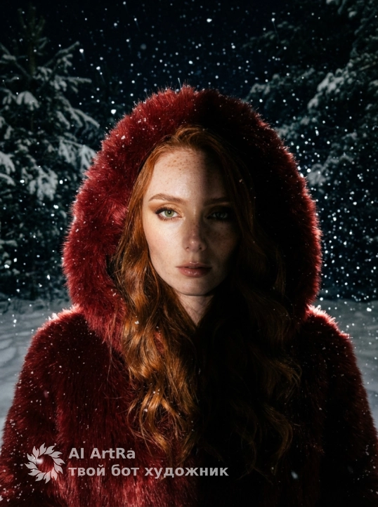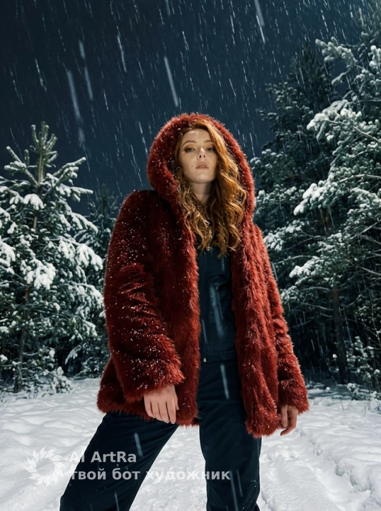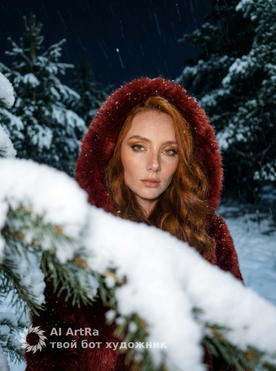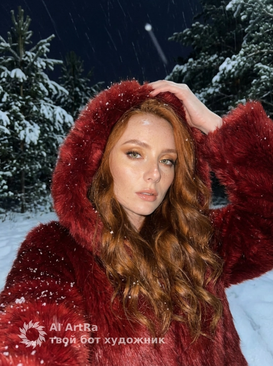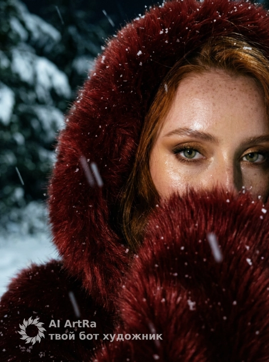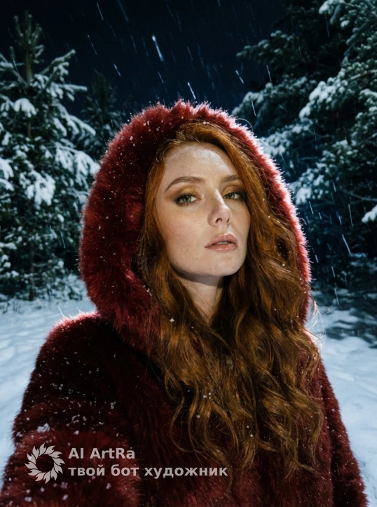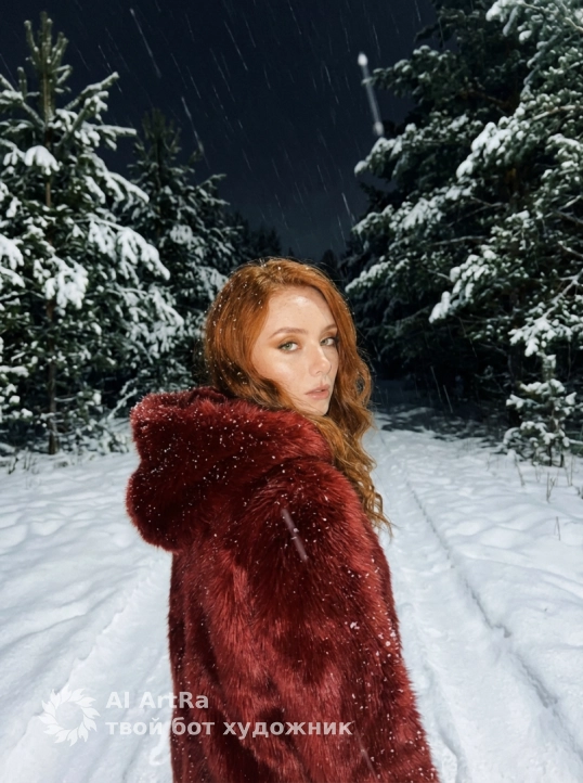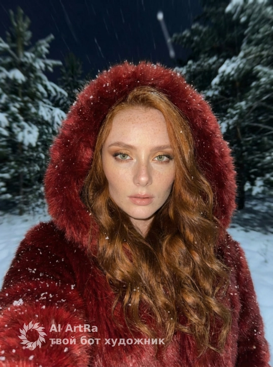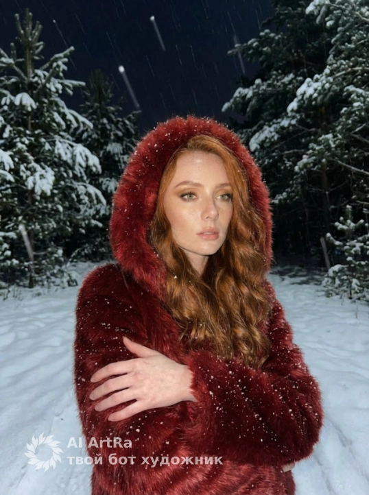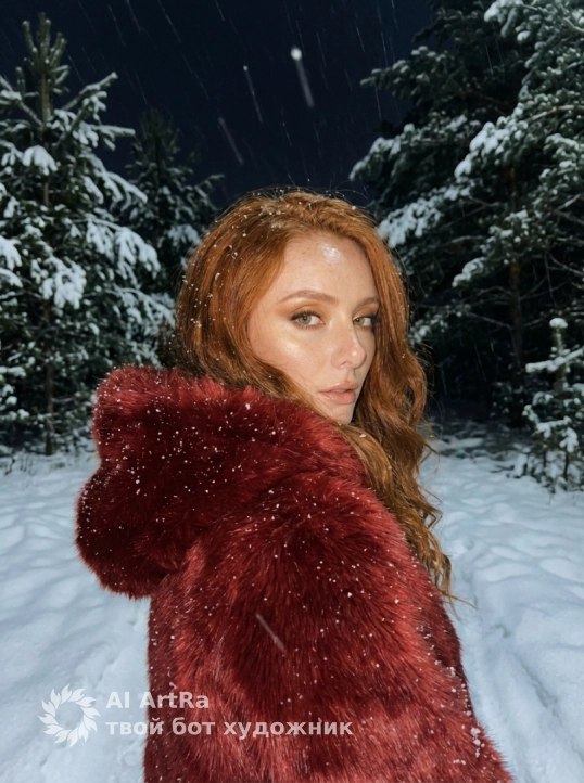 Используй лицо с моей референс-фотографии (face reference), сохрани узнаваемость на 100% : не меняй овал лица , форму носа , брови, губы, цвет глаз, длину волос и цвет волос. Зимний портрет в лесу : девушка в красной меховой верхней одежде, падающий снег и высокие сосны на фоне, вертикальный кадр по грудь, селфи‑ракурс чуть сверху, естественный мягкий дневной свет, неглубокая глубина резкости, холодная палитра с тёплыми бежевыми акцентами, текстуры меха и вязки хорошо видны.Макияж: современный натуральный гламур :ровный сияющий тон, легкий контуринг, нежный румянец, теплые золотисто‑коричневые тени с легким шиммером, аккуратные брови, подчеркнутые ресницы, нюдовые губы с глянцем.Поза: одна рука поднята к голове, корпус слегка повернут к камере, непринужденная уверенная поза в стиле селфи. Ночь фото со вспышкой Волосы прямые с мягкими волнами, немного растрёпанные пряди свободно падают на плечи.