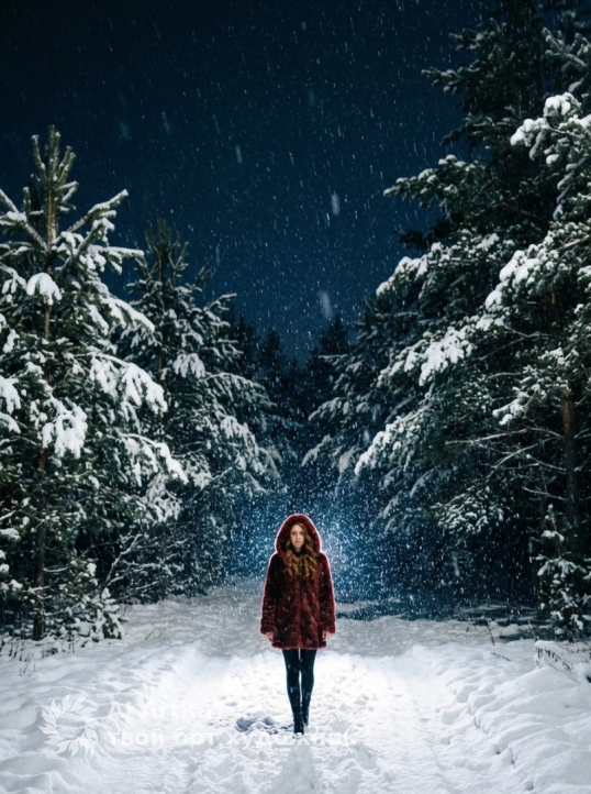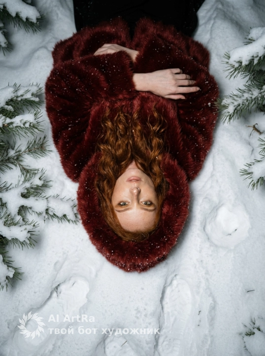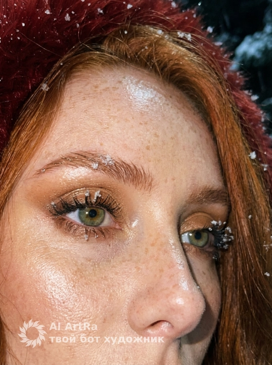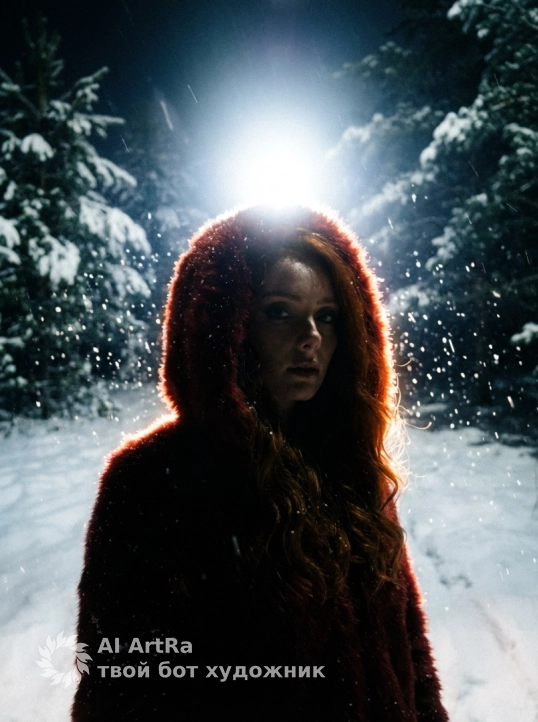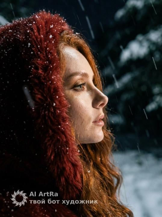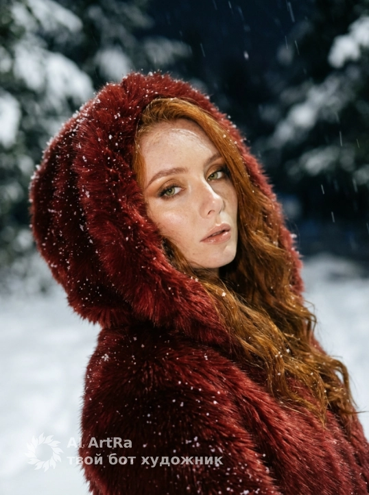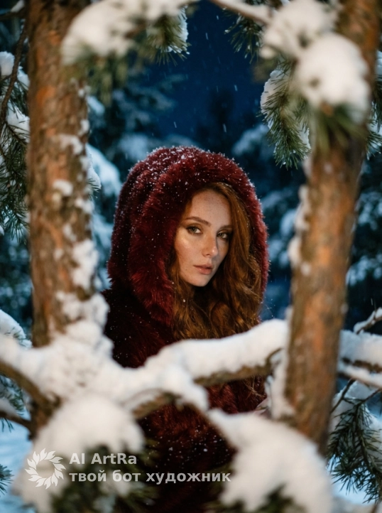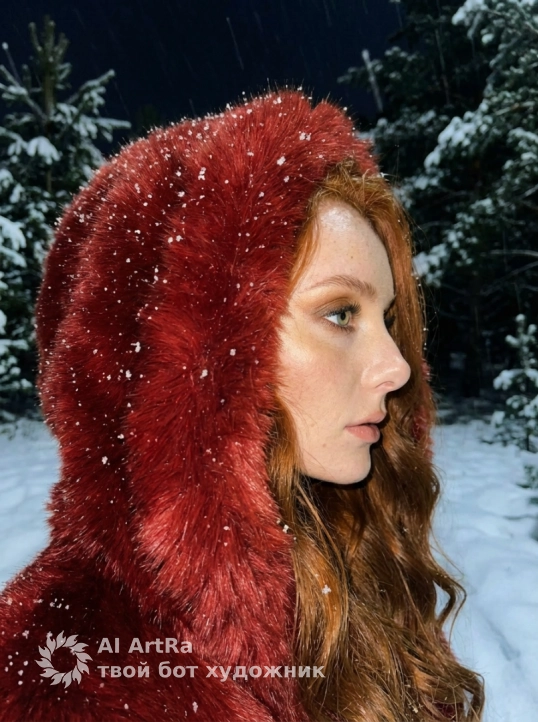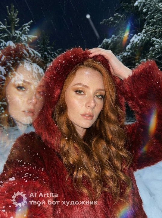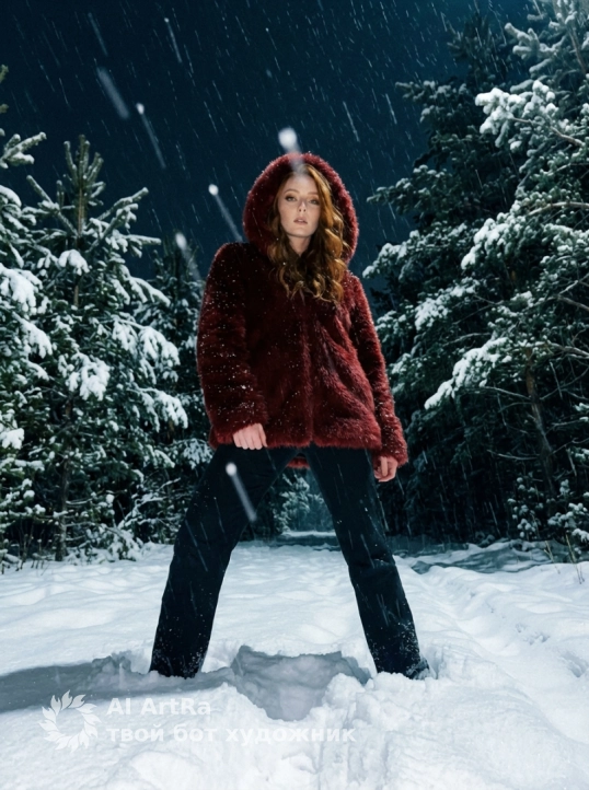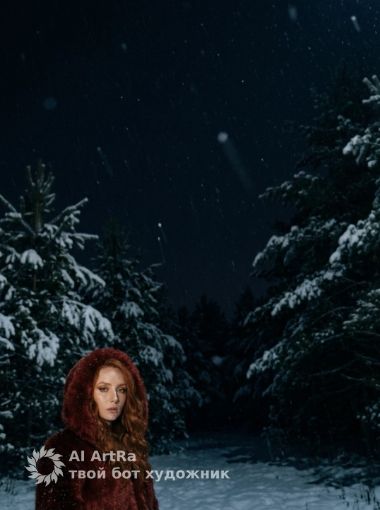 Используй лицо с моей референс-фотографии (face reference), сохрани узнаваемость на 100% : не меняй овал лица , форму носа , брови, губы, цвет глаз, длину волос и цвет волос. Зимний портрет в лесу : девушка в красной меховой верхней одежде, падающий снег и высокие сосны на фоне, вертикальный кадр по грудь, селфи‑ракурс чуть сверху, естественный мягкий дневной свет, неглубокая глубина резкости, холодная палитра с тёплыми бежевыми акцентами, текстуры меха и вязки хорошо видны.Макияж: современный натуральный гламур :ровный сияющий тон, легкий контуринг, нежный румянец, теплые золотисто‑коричневые тени с легким шиммером, аккуратные брови, подчеркнутые ресницы, нюдовые губы с глянцем.Поза: одна рука поднята к голове, корпус слегка повернут к камере, непринужденная уверенная поза в стиле селфи. Ночь фото со вспышкой Волосы прямые с мягкими волнами, немного растрёпанные пряди свободно падают на плечи.