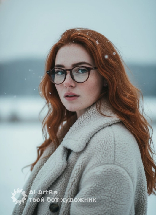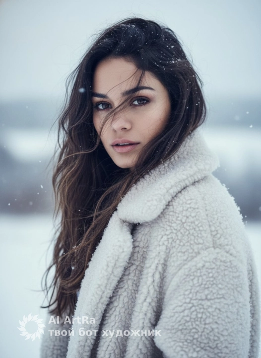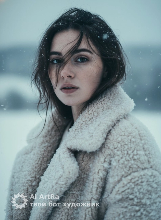 Не меняя внешности женщины с фото, она изображена в кадре крупным планом, повернувшись практически фронтально с незначительным отклонением головы влево, её выразительный взгляд устремлен прямо в камеру, передавая ощущение глубокой сосредоточенности и лёгкой задумчивости. Волосы темные, слегка растрепаны ветром, который играет прядями, создавая эффект живого движения, некоторые пряди мягко ложатся на лоб, где заметны мелкие снежинки. На ней объемное, густое пальто из светлого материала с пушистым ворсом, который будто наполнен снежными кристаллами — текстура шубы выглядит мягкой и теплой, с выраженной фактурой шерсти. Свет мягкий, рассеянный, словно в пасмурный зимний день, оттеняя черты лица и создавая легкие тени, которые подчеркивают овал лица и скулы, придавая композиции тонкий, кинематографичный налет интроспекции. Фон смутный и плохо различим, но отчетливо передает атмосферу зимнего пейзажа с бело-коричневыми оттенками, словно заснеженные холмы или поля, что усиливают чувство холодной свежести и уединенности момента. Вся сцена наполнена мелкими падающими снежинками, которые размыты и свежи, усиливая ощущение живого холода и естественной красоты окружающей среды. Цветовая палитра выдержана в приглушённых, холодных тонах голубого и белого с мягкими переходами, придавая изображению гармоничное и утонченное звучание. Все детали внешности женщины сохранены — лицо четко выписано с акцентом на выразительные глаза и натуральный макияж, эмоциональное состояние передается через взгляд и легкое напряжение в позе, создавая впечатление живого портретного момента, наполненного чувственностью и лёгкой меланхолией, фотореалистичное изображение, высокая текстурная детализация, высокое качество, разрешение 4K.