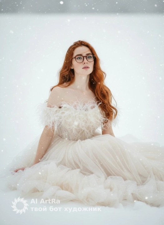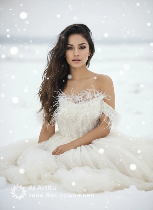 Create a dreamy winter scene with a young woman sitting gracefully in a snow-covered landscape. She has long, wavy hair that flows gently in the wind, with a few strands softly falling across her face. Her gaze is soft yet captivating, with natural makeup that highlights her features, including bold brows, neutral eyeshadow, and soft pink lips. She wears a delicate, off-shoulder gown made of soft tulle with a feathered bodice that adds an ethereal, luxurious touch to the outfit. The gown is a pale ivory color, flowing out into layers of tulle, creating a soft, voluminous look. Snowflakes are gently falling around her, creating a magical and serene atmosphere. The background is a soft blur of white snow, with no other objects visible, enhancing the feeling of isolation and peace in the winter scene. The lighting is soft and natural, with the snowflakes catching the light and glistening in the air. Use the user's appearance 1:1 — face, skin, hair and body without any changes.