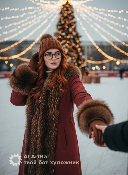 Сделай ультра реалистичное фото по моему селфи, максимально сохраняя мою внешность один в один: те же черты лица, те же глаза, рот и нос, та же форма головы и тип телосложения. Не омолаживай и не стройни меня, не меняй возраст и пропорции тела. Сохрани натуральную текстуру кожи, мой макияж , естественную асимметрию моего лица, морщинки, и то же выражение лица, что на исходном фото. Не улучшай и не ретушируй лицо. Одень меня в длинную слегка приталенную красно-бордовую парку. Главное условие: парка полностью расстёгнута и одета на распашку, молнию и застёжку не видно, они полностью закрыты густым мехом.Спереди идёт широкая вертикальная полоса очень густого и длинного тёмно-коричневого меха лисы вдоль всей линии застёжки. Такой же густой мех по краю большого капюшона и на широких меховых манжетах рукавов. Капюшон СНЯТ и лежит на плечах и спине, капюшон ни в каком виде не надет на голову. На голове НЕТ капюшона, только шапка. На голове тёплая вязаная шапка того же коричневого цвета, что и варежки, с помпоном из меха. На руках тёплые коричневые варежки. Под расстёгнутой паркой видна светлая тёплая водолазка или свитер. Волосы аккуратно уложены, длина и цвет такие же, как на исходном фото, часть прядей свободно лежит поверх меха и немного выглядывает из-под шапки, но не закрывает лицо. Я стою на открытом зимнем катке, кадр по пояс, фокус на моём лице. Камера чуть ниже уровня глаз. Перспектива такая, будто человек передо мной держит меня за руку: я протягиваю вперёд правую руку в варежке и уверенно держу его руку; в кадре видна только его рука в тёмной зимней куртке. Левой рукой я слегка придерживаю или поправляю шапку у головы. На заднем плане снежное поле катка, позади большая новогодняя ёлка, плотно украшенная игрушками и тёплыми огоньками. От вершины ёлки во все стороны расходятся яркие гирлянды огней над нами. Фон мягко размытый, зимний вечер, много тёплых светящихся огоньков, уютная романтичная атмосфера. Негативный промпт: улучшение или ретушь лица, изменение черт лица, изменение фигуры и пропорций тела, изменение возраста, другое выражение лица, полностью симметричное лицо , вид в полный рост, вид сбоку или сзади, другой ракурс, отсутствие жеста «держимся за руки», деформация рук и пальцев, лишние или отсутствующие пальцы, изменение цвета глаз и формы носа, короткая парка, полностью застёгнутая парка, видимая молния или застёжка на парке, узкая полоса меха, слабый или редкий мех, любой капюшон на голове, даже частично надетый, капюшон, закрывающий голову или лоб, отсутствие шапки, светлое дневное освещение, мало огоньков над головой и вокруг ёлки, неестественная улыбка, сильное размытие лица, цифровые артефакты.