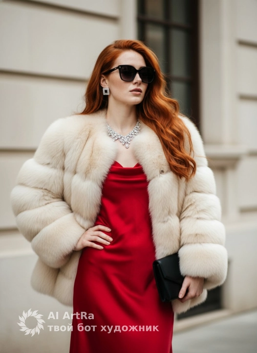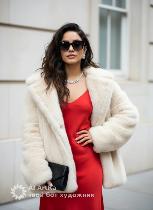 Создай изображение девушки, сохрани её внешность. Элегантная девушка запечатлена на уличной фотографии не в полный рост, излучая утонченность и гламур. Ее стройная фигура одета в роскошную объемную шубу из светлого меха, накинутую поверх струящегося красного атласного платья-комбинации.