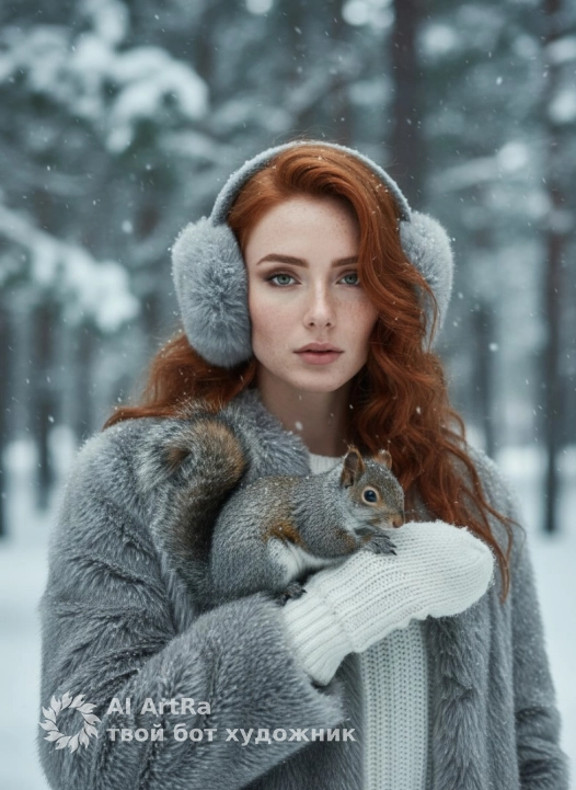крупный план в зимнем лесу при падающем снеге — женщина в серой меховой шубе и серых наушниках-муфтах, в белом вязаном свитере и белых вязаных варежках, с длинными волнистыми волосами; на руке/плече сидит серая белка. Мягкое естественное освещение, холодная палитра серо‑голубых тонов, мелкие снежинки на одежде, детализированная текстура меха и шерсти белки, размытый фон соснового леса, малая глубина резкости, уютная атмосферная композиция, высокая детализация и разрешение, стиль модной зимней фотосессии; параметры съемки: 50mm, f/1.8, низкий ISO, мягкий контраст, легкая цветокоррекция в холодную сторону.Use the user's appearance 1:1 — face, skin, hair and body without any changes.
