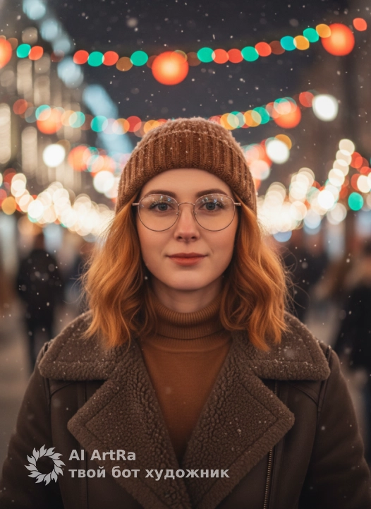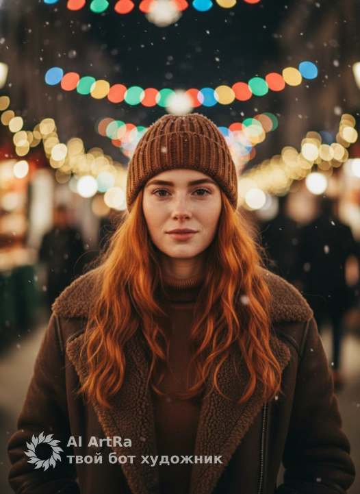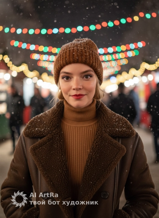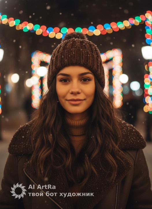 A medium shot of a woman in a winter outfit, taken outdoors. She looks directly at the camera with a serene expression against the bright bokeh of holiday lights at night. The medium shot is at eye level, focusing primarily on the woman's face and upper body with a shallow depth of field. She is wearing a brown knit hat and a dark brown shearling coat over a brown turtleneck sweater. Outdoors, at night, at a festive winter market or illuminated street, snow can be seen in the air. The background is completely blurred, turning into a bright, colorful bokeh of many out-of-focus garlands of red, green, blue, and yellow. The night lighting is subdued and atmospheric. The main illumination comes from multi-colored lanterns with a bokeh effect, creating a soft, diffused glow. Shot with a 135mm portrait lens, extremely shallow depth of field. Photorealistic.