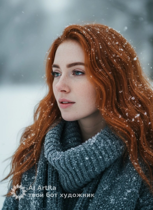 Не меняя внешности девушки с фото, запечатлена пронзительная зимняя сцена, где её лицо обращено в сторону, словно она всматривается в даль с лёгким задумчивым выражением, слегка приоткрытые губы и нежные черты лица сохраняют индивидуальность и реализм. волосы свободно развеваются и усыпаны пушистыми хлопьями только что опавшего снега, подчёркивая атмосферу свежести и холода. Её голубые глаза выделяются на фоне белоснежной снежной пелены и мягкого блика, который мягко обрамляет её профиль. Тело девушки укутано в объёмный свитер или шарф крупной вязки насыщенного серо-голубого оттенка, поверхность которого подчеркивает фактуру грубой шерсти, создавая контраст с нежностью свежевыпавшего снега. Свет мягкий и рассеянный, будто проходит сквозь облака, делая все тени приглушёнными, но в то же время проникающими, что придаёт сцене кинематографическую глубину и меланхоличное настроение. Фон размытый, покрытый плотным снежным покрывалом, создавая атмосферу уединённости и покоя, усиливая ощущение зимнего затишья и тишины. Общая композиция сконцентрирована на лице, шее и верхней части тела девушки, с плавным переходом фокусировки от детализации крупной вязки к мягкой размытости фона, что создает ощущение естественного, неподдельного момента в холодном времени года, фотореалистичное изображение, высокая текстурная детализация, высокое качество, разрешение 8K.
