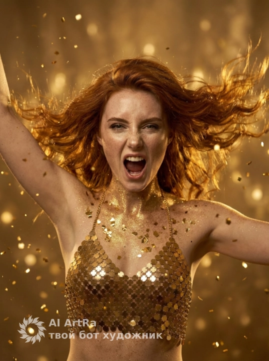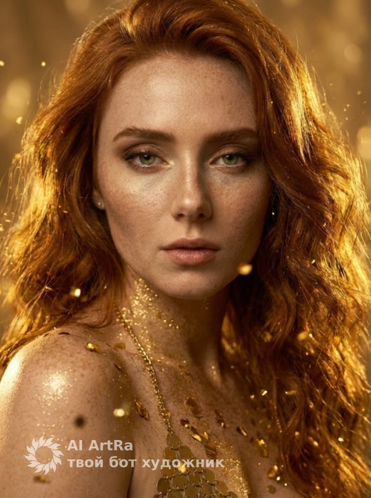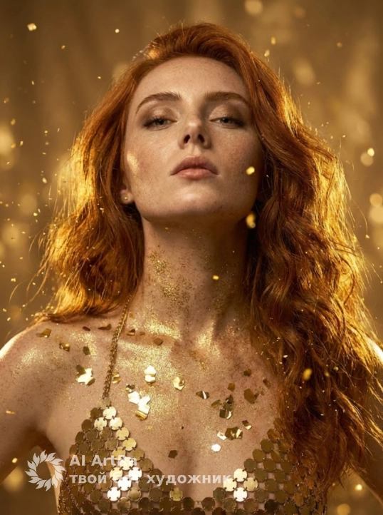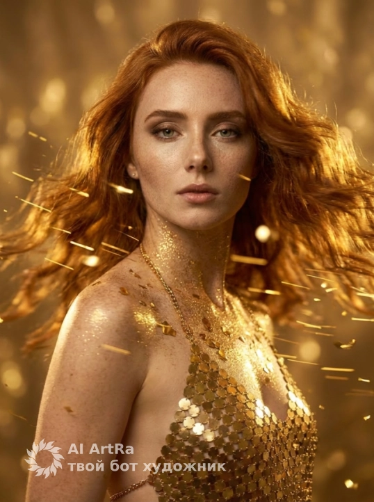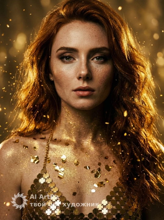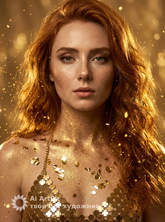 Фотореалистичный гламур‑портрет: женщина, ее черты лица оставь без изменений, в роскошном золотом образе, тело и декольте покрыты золотой крошкой и крупными металлическими конфетти, на ней цепочечный топ из шестиугольных золотых дисков. Длинные волнистые волосы с мерцающими бликами, вокруг летят искры и золотые частицы, тёплое кинематографическое золотое освещение, мягкое боке на фоне. Ультрадетальная кожа с золотым сиянием, контрастный рим‑лайт, объёмные тени, высокое разрешение, HDR, тонкая зернистость пленки. Камера: 85mm, f/1.8, shallow depth of field. Стиль: гламурная фэнтези‑фотосессия, элегантно‑завораживающая цветокоррекция. Negative prompt: lowres, watermark, extra people, awkward anatomy, harsh artificial colors.