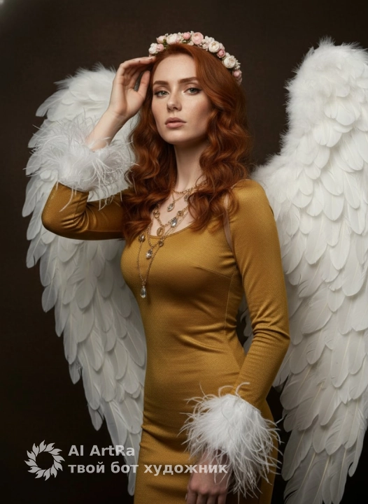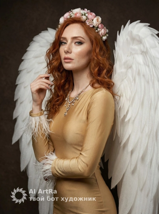 Используйте внешний вид пользователя, референса 1:1 — лицо, кожу, волосы и тело без каких-либо изменений. На изображении — женщина в позе полупрофиля, слегка повернутая к камере, с рукой, нежно прикасающейся к волосам, другая рука опущена вдоль тела; на ней — облегающее платье золотистого цвета с длинными рукавами, украшенными белыми перьями на манжетах, на шее — многоярусное ожерелье с подвесками и кристаллами, в волосах — венок из нежных розовых и белых цветов; за спиной — огромные белоснежные ангельские крылья с детализированными перьями; макияж — драматичный, с чётким контуром глаз, тёмной подводкой, акцентом на ресницах и нюдово-розовыми губами; ногти — короткие, аккуратные, с матовым светлым покрытием; фон — тёмно-коричневый, текстурированный, создающий контраст с ярким нарядом; освещение — мягкое студийное, с боковым источником, подчеркивающим объём крыльев и блеск ткани; композиция — средний план, камера на уровне глаз, с лёгким ракурсом снизу, создающим ощущение величия; атмосфера — мистическая, благородная, с нотками нежности и священного величия.