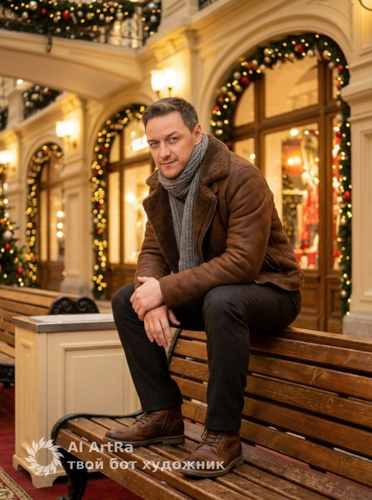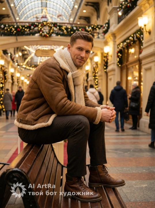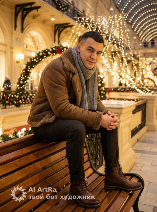 A mid-shot inside GUM with Christmas garlands and warm lights in the background. Pose: seated on a wooden bench, leaning forward with forearms resting on thighs, hands clasped, relaxed expression. Outfit: shearling jacket, chunky knit scarf, wool trousers, casual winter boots. Hairstyle: neat short haircut. Lighting: golden festive glow, soft shadows, bokeh from string lights. Camera: slightly higher angle. Mood: cozy upscale holiday atmosphere.