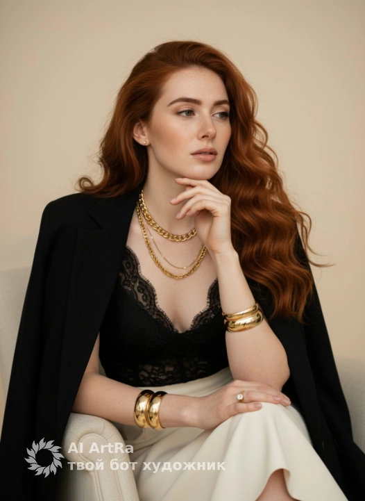 Крупный план студийного портрета женщины, задумчиво смотрящей в сторону, с рукой на подбородке, демонстрирующей элегантные золотые украшения и шикарный наряд. Крупный план верхней части туловища с задумчивой позой. Легкий макияж глаз, блестящие нюдовые губы и ровный тон кожи. Волосы объемные и идеально уложены. На ней черный оверсайз пиджак, накинутый на плечи. Под пиджаком виден кружевной топ, открывающий часть кремовой юбки. Она украшена несколькими элегантными золотыми аксессуарами: толстым золотым ожерельем, тонким изящным золотым ожерельем, двумя широкими золотыми браслетами на каждом запястье и сверкающим кольцом на правой руке. В помещении, профессиональная студийная обстановка на однотонном, бесшовном, очень светло-бежевом фоне. Женщина сидит на кремовом обитом стуле. Мягкое, рассеянное и приятное студийное освещение создает нежные блики на коже, волосах и металлическом блеске золотых украшений. Снято портретным объективом 85 мм, малая глубина резкости создает фотореалистичный эффект.