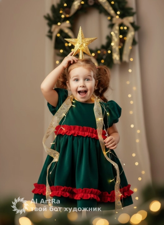 Full-length portrait of a little girl standing in a studio, she holds a shining star-shaped Christmas tree topper on her head with one hand, dressed in a dark green puffy dress with red ruffles, her body is wrapped in a glowing garland with warm lights and a decorative beige patterned ribbon, angled at eye level, light solid color studio background with a blurred Christmas wreath with garland curtain in the background, soft warm studio lighting, frontal light, soft shadows, festive and cozy atmosphere, shot with an 85mm portrait lens, shallow depth of field, clear focus on the girl, photorealistic style.