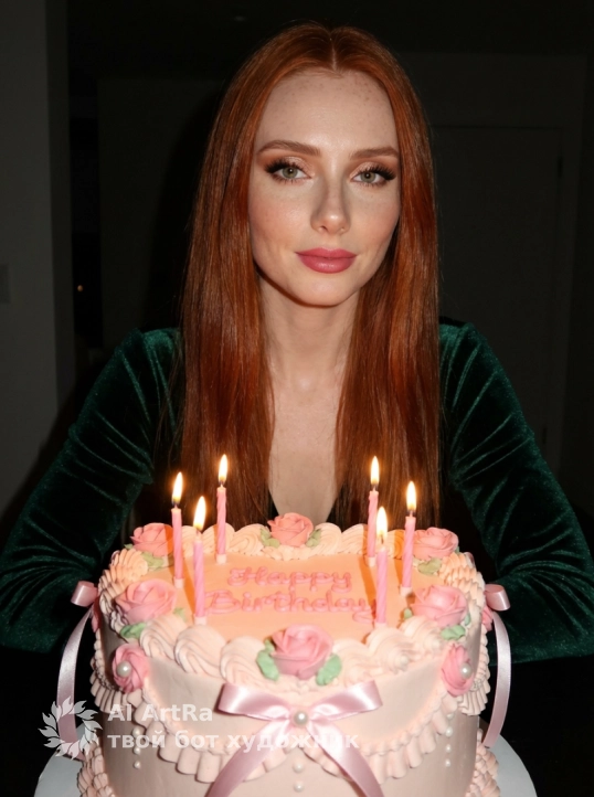 Behind the cake, a young woman sits at a wooden table. She has long, straight, shiny hair, parted in the middle, cascading over her shoulders and chest. Her makeup is glamorous: perfectly defined eyebrows; Warm, neutral shimmery eyeshadow; thick black lashes; precise eyeliner; full lips painted in a glossy nude-pink shade. Soft, warm highlights add radiance to the skin.
