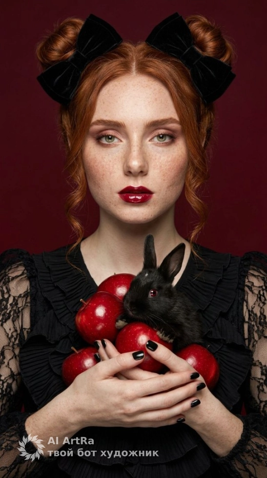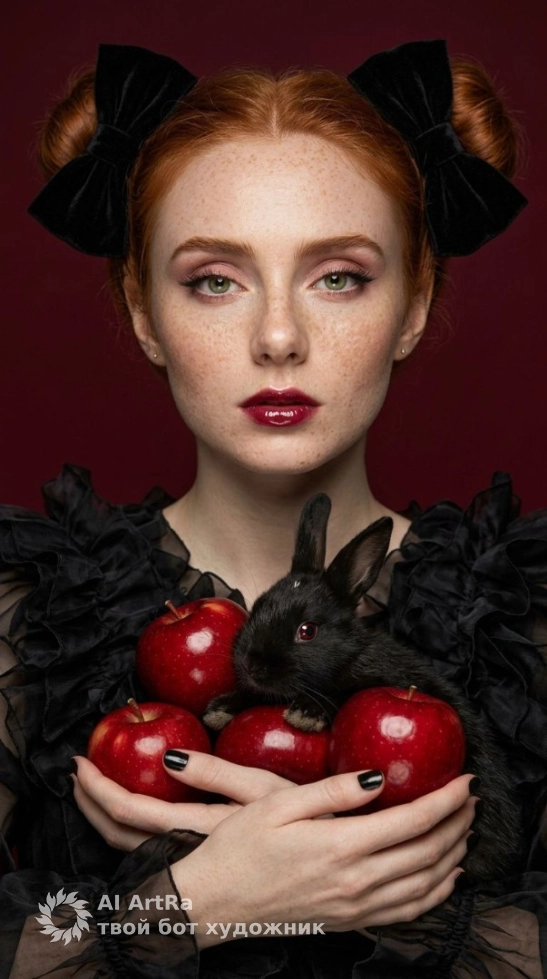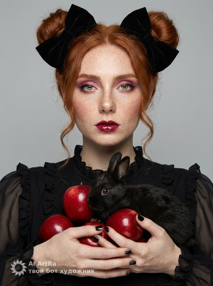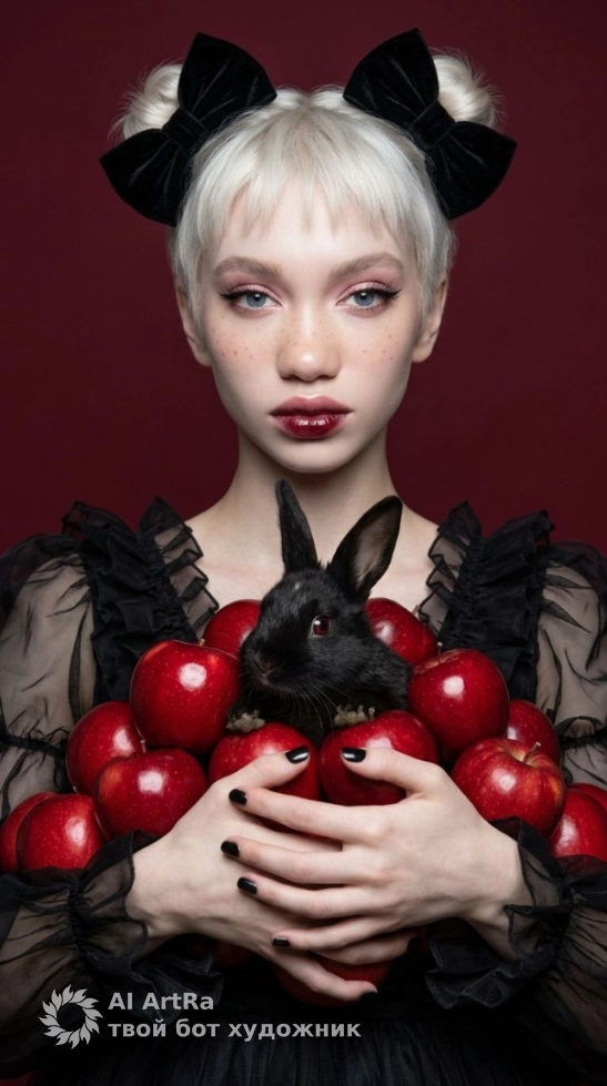 Вы когда-нибудь мечтали стать героиней своей собственный сказки? С нашей уникальной фотосессией вы сможете достичь этого! Представьте себя в образе изысканной девушки в пышном черном платье, держащей в руках калейдоскоп ярко-красных яблок, окруженную маленьким черным кроликом. Вам лишь нужно немного изменить существующий промпт, и мы поможем создать точный визуальный образ, соответствующий вашим пожеланиям.