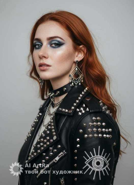 Используйте внешний вид пользователя, референса 1:1 — лицо, кожу, волосы и тело без каких-либо изменений. На лице — драматичный макияж с резкими, вытянутыми стрелками, насыщенным тенями в холодных тонах, акцентом на скулах и нежно-розовыми губами с глянцевым финишем; маникюр не виден, но на шее — массивный черный шейный ободок с серебряными заклепками и кристаллами, дополненный цепочками, а на ушах — крупные висячие серьги с геометрическим орнаментом и камнями; главный объект — женщина в стиле готик-панк, одетая в черную кожаную куртку с металлическими заклепками, молниями и вышивкой в виде глаза на рукаве, позирует в полупрофиль, слегка наклонив голову, с прямым взглядом в камеру; художественный стиль — гиперреалистичная студийная фотография с мягким боке; фон — однотонный светло-серый, нейтральный; освещение — студийное, мягкое, фронтальное, с легкими бликами на коже и кожаной поверхности; камера — на уровне глаз, ракурс — средний план, фокус на лице и верхней части туловища; атмосфера — дерзкая, уверенная, с оттенком мистического шика.