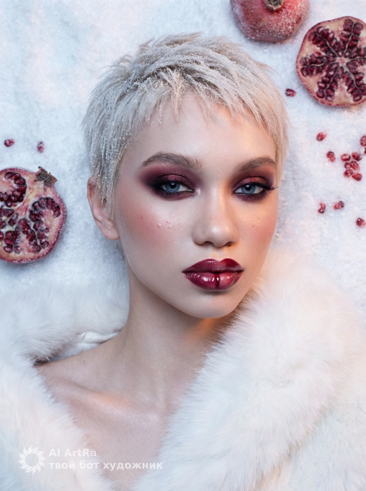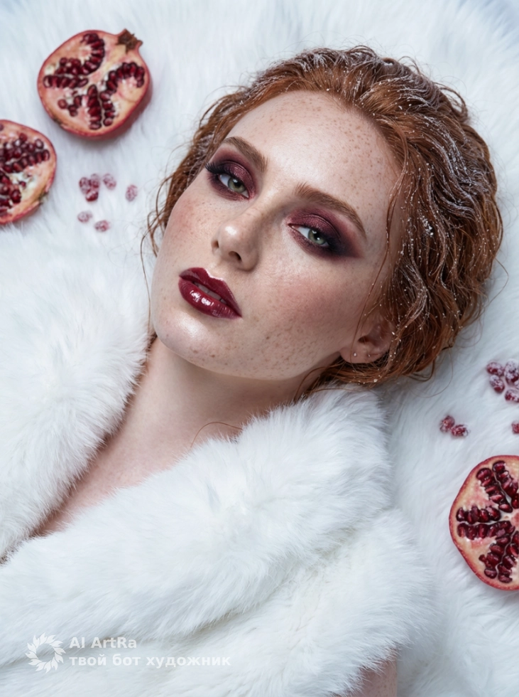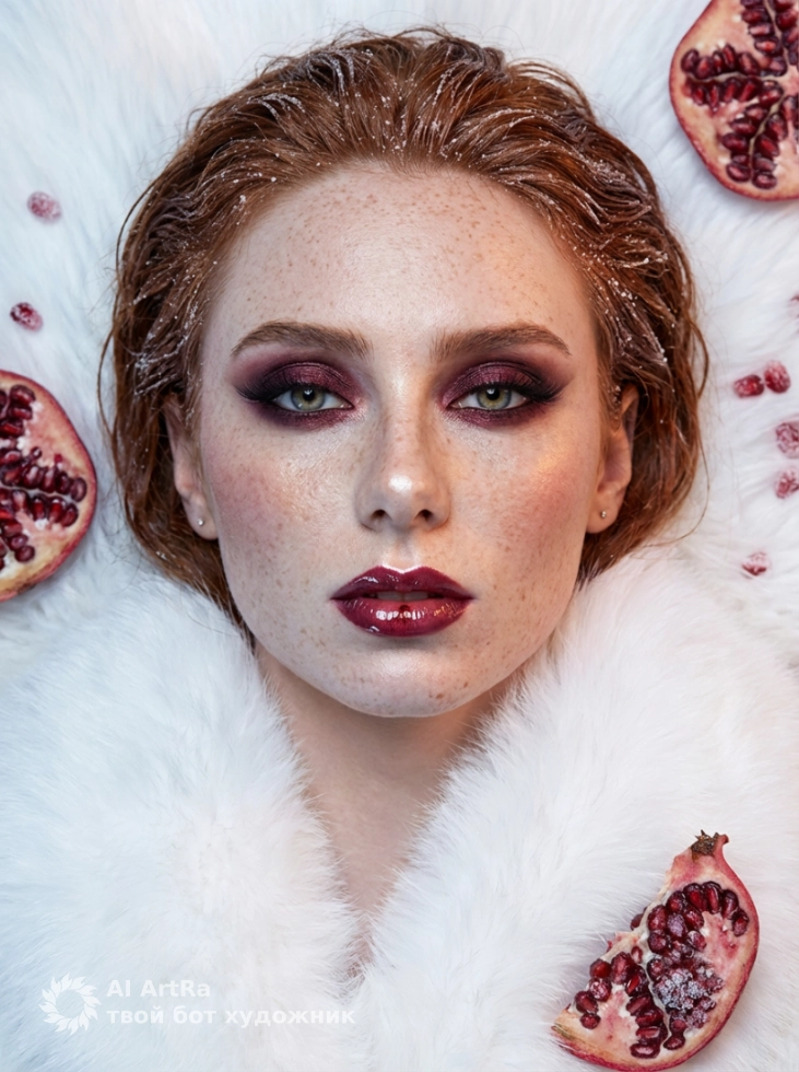 Гранатовая симфония создаёт волшебную атмосферу с белым меховым фоном и глубокими бордовыми оттенками макияжа. Это идеальный выбор для тех, кто хочет показать себя во всей красе, будь то для создания контента для социальных сетей, оформления профилей или даже для вашего личного бренда.