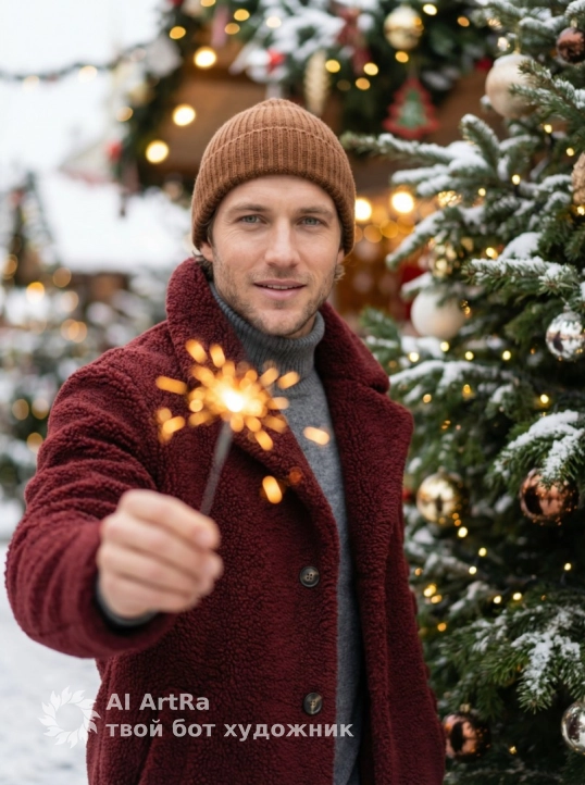 A natural winter holiday portrait of a man — face must remain 100% unchanged and identical to the uploaded reference photo. He stands outdoors near a decorated Christmas tree with warm festive lights, ornaments, and soft glowing bokeh in the background. He reaches his hand toward the camera, creating a dynamic depth effect with gentle motion blur and floating golden sparks from a lit sparkler. His expression is warm, joyful, and natural — calm confidence with a subtle smile.