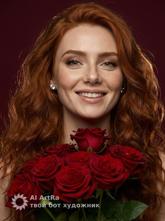 Large 2-carat brilliant-cut diamond stud earrings sparkle with prismatic light. She holds a lavish bouquet of velvety crimson Grand Prix roses against her chest and torso, petals cascading downward, soft roses touching her neck and décolletage, creating sensual vertical flow.