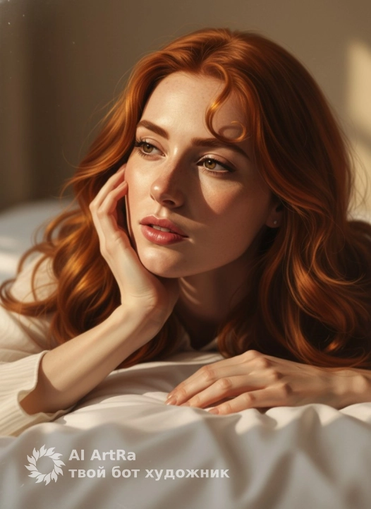 Не изменяя лицо оставить как есть. Экстремально близкий, кинематографичный портрет: Женщина лежит на белой простыне, слегка наклонив голову, взгляд устремлен в сторону, как будто она поглощена мыслями. Одна рука поддерживает голову, другая аккуратно лежит на ткани, подчеркивая естественное движение тела. Волны волос обвивают лицо и плечо, прядь падает на лоб, добавляя динамики. Свет играет на лице, создавая контраст: полоса солнечного света ложится на щеки, оставляя часть лица в полутени. Кожа идеально гладкая, с естественным сиянием, световые блики акцентируют контуры челюсти и губ. Глаза подчеркнуты тенями, ресницы придают выразительность. Губы имеют естественный розовый оттенок, мягко контурируются, создавая объем. Теплые золотистые тона фона создают атмосферу уюта и спокойствия. Вся сцена наполнена мягким светом, подчеркивающим детали и создающим кинематографичный эффект глубины.