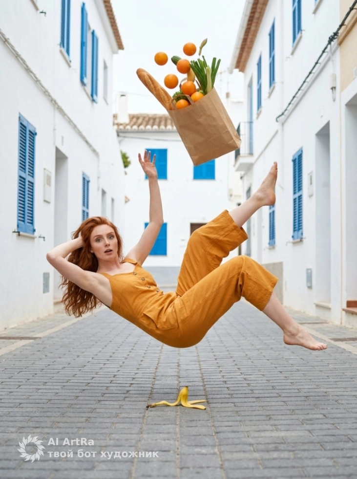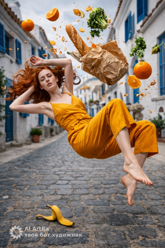 Представьте себе, как вы парите в воздухе среди взлетающих продуктов – апельсинов, багетов и овощей в ярком и динамичном кадре. Это не только комедийный эффект, но и стильное изображение, которое точно привлечет внимание к вашему профилю. Открывайте новые горизонты с ARTRA и создайте свой уникальный визуальный языковой репертуар, который выделит вас из толпы!