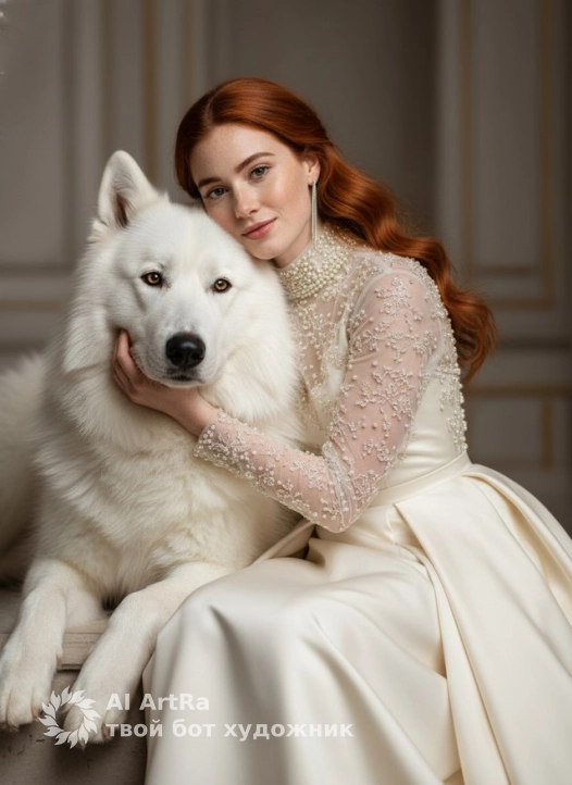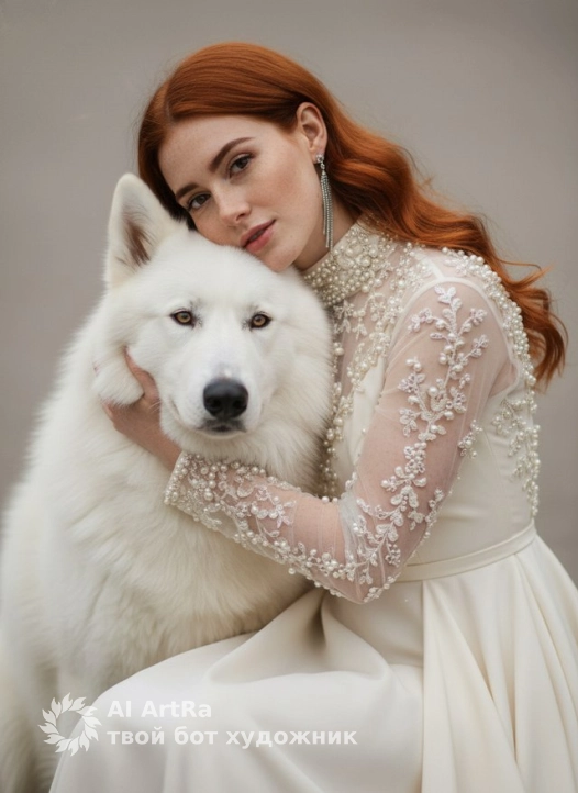 Элегантная женщина обнимает крупную белоснежную собаку с густой шерстью, похожую на арктического волка, создавая атмосферу уюта и гармонии. Женщина одета в роскошное платье кремового оттенка с длинными прозрачными рукавами, украшенными вышивкой из мелких жемчужин и бусин, которые сверкают в мягком свете. Воротник платья высокий и полностью инкрустирован мелкими жемчугами, подчёркивая изысканность её образа. Её волосы аккуратно уложены в волны и ниспадают за плечи, добавляя утончённости. На ушах — длинные изящные серьги, переливающиеся серебристым блеском, которые прекрасно гармонируют с жемчужным декором платья. Лицо женщины смотрит прямо в камеру . Собака спокойная, с умным и выразительным взглядом жёлтых глаз, её пушистая белая шерсть подчёркивает контраст с богатством деталей платья. Женщина нежно прижимается щекой к собаке, выражая заботу и привязанность. Фон изображения нейтральный и слегка размыт, что позволяет сосредоточиться на центральных фигурах. Свет мягкий и рассеянный, подчёркивающий текстуры ткани, блеск украшений и пушистую шерсть собаки. Атмосфера фотографии передаёт ощущение королевской грации, уюта и глубокого взаимопонимания между человеком и животным. Используйте внешность пользователя 1:1 — лицо, кожу, волосы и тело без каких-либо изменений.