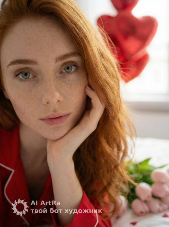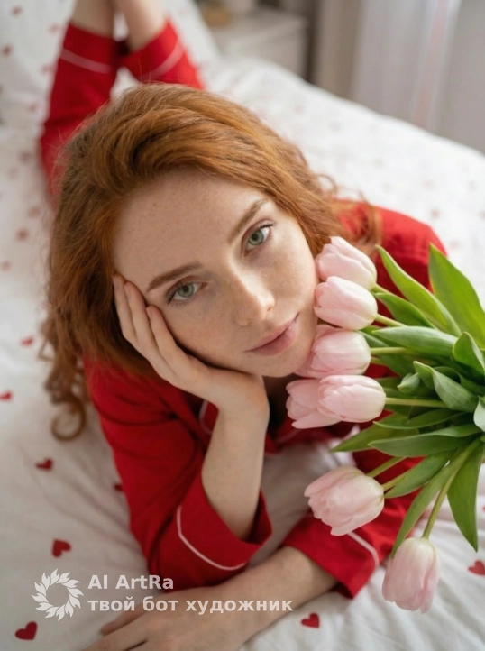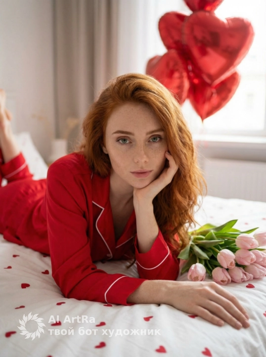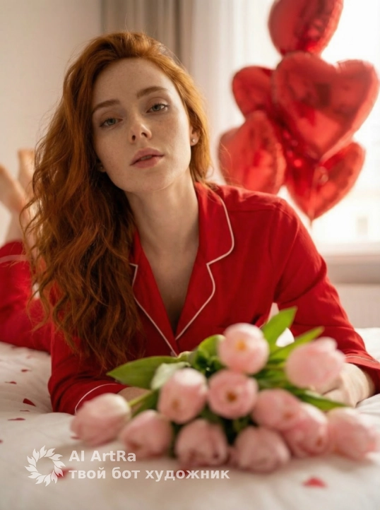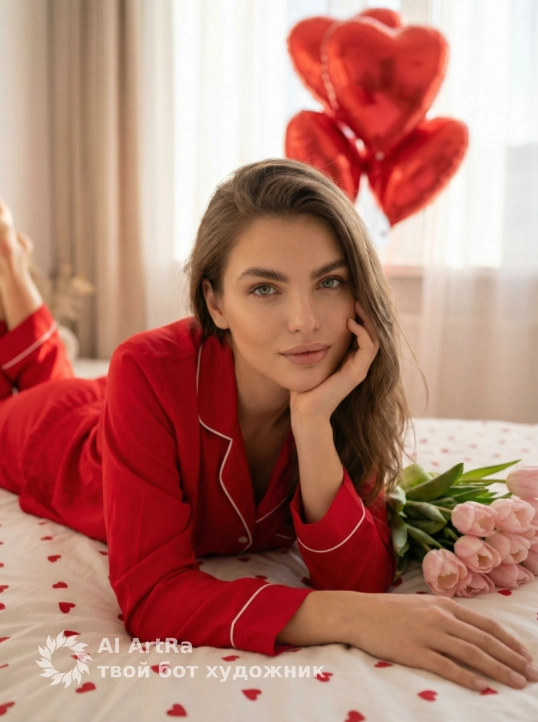 Используйте внешний вид пользователя, референса 1:1 — лицо, кожу, волосы и тело без каких-либо изменений. На изображении — женщина в красной пижаме с белой окантовкой, лежащая на животе на кровати, подбородок опирается на левую ладонь, правая рука свободно лежит на белом покрывале с мелким рисунком красных сердечек; рядом с ней — букет нежно-розовых тюльпанов, а на заднем плане, у окна, парят несколько глянцевых красных шаров в форме сердец; макияж естественный, с акцентом на выразительные брови и легкий блеск на губах, ногти короткие, ухоженные, без лака; украшений нет; стиль — гиперреалистичная цифровая фотография с мягким рассеянным дневным светом, создающим нежную, романтическую атмосферу; композиция — средний план, ракурс немного сверху, камера на уровне глаз, фокус на лице и верхней части тела, фон слегка размыт, цветовая палитра теплая, с доминированием красного, розового и белого, передающая ощущение уюта, нежности и праздничного настроения.
