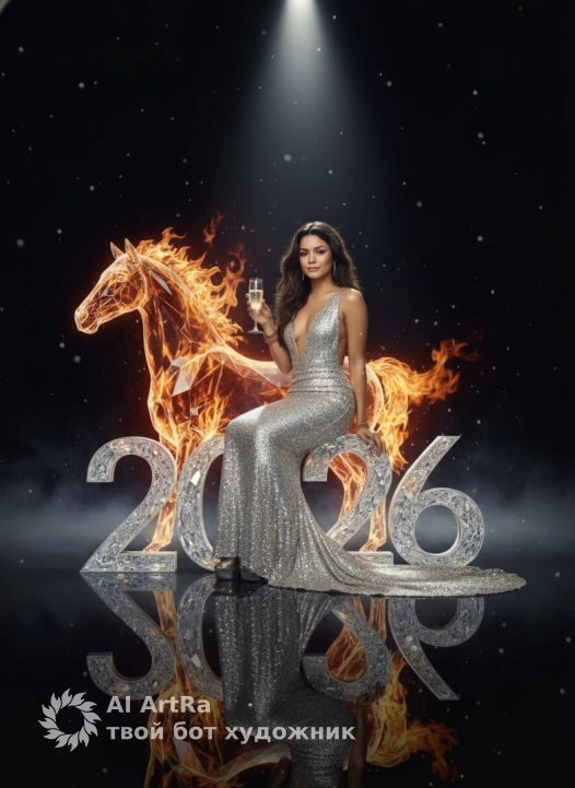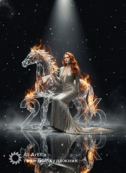 Фотореалистичная гламурная сцена в стиле модного журнала: в центре — элегантная женщина, сидящая на цифрах «2026». Цифра «2» стилизована под изящную кристаллическую лошадь с вытянутой шеей и головой, выполненной из прозрачных алмазоподобных граней. С боку от женщины пламя огня , и лошадь как будто огненная