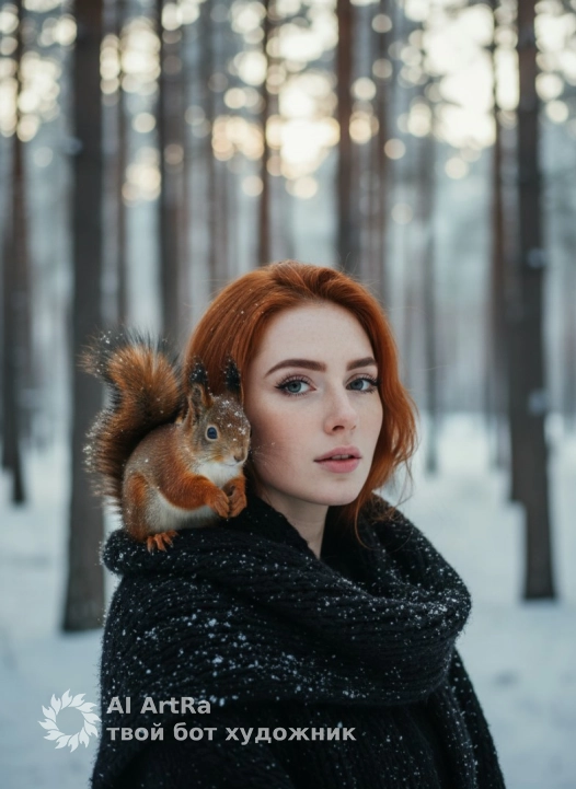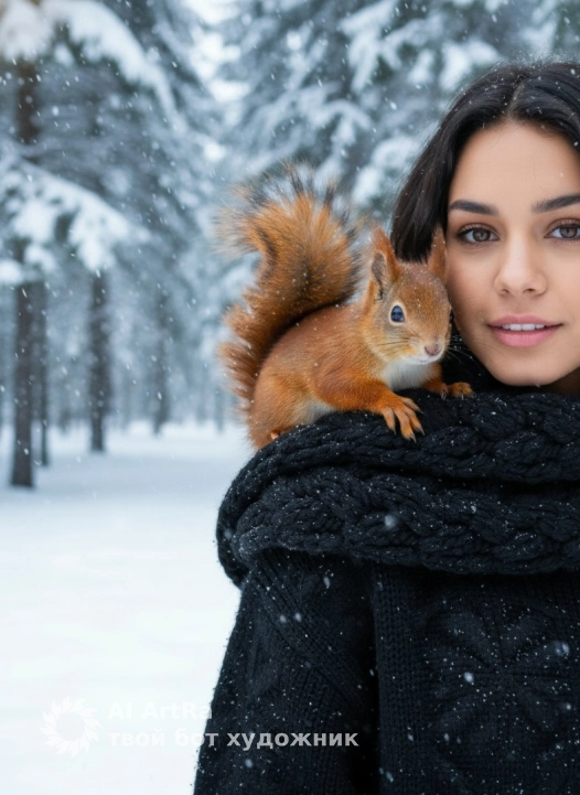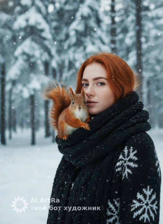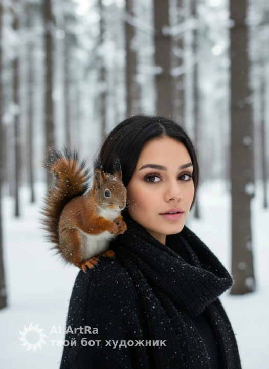 Используйте внешний вид пользователя, референса 1:1 — лицо, кожу, волосы и тело без каких-либо изменений. Крупный план девушки, на объемном черном вязаном шарфе с текстурным плетением сидит рыжая белка с пышным хвостом, держащаяся передними лапками за край шарфа, её мордочка приближена к лицу девушки, а глаза направлены в камеру; зимний лес на фоне — высокие хвойные деревья, покрытые свежим снегом, снежный покров на земле и падающие снежинки, создающие атмосферу тихой волшебной сказки; фотореалистичный стиль с мягким рассеянным дневным светом, холодные синевато-белые тона фона контрастируют с теплыми рыжими и оранжевыми оттенками белки и акцентами на черной одежде; композиция с глубиной резкости, выделяющей детали шерсти животного, текстуру шарфа и снежинки на ворсе, ракурс слегка сбоку, передающий интимность момента; черный свитер с объемным узором и крупными снежинками на ткани, поза белки естественная, передающая доверительное взаимодействие с человеком, общее настроение — умиротворенное, соприкосновение с природой в зимней идиллии.