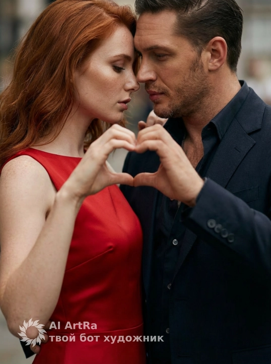 Мужчина и женщина стоят очень близко друг к другу. Их руки подняты и соединены перед грудью, образуя символическое сердце. Лица находятся рядом, между ними ощущается интимная близость и эмоциональное напряжение.