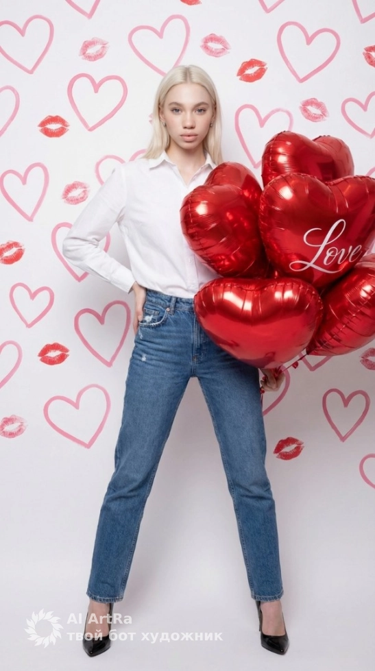 Представьте себя в атмосфере романтики — утончённая белая рубашка, синие джинсы и пышный букет из глянцевых красных шаров в форме сердец, создают нежный образ, включая смысл любви и исполнения желаний. Студийная съемка с аккуратным освещением и оригинальным фоном сделает ваш образ поистине незабываемым!