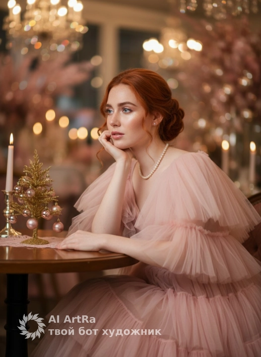 A dreamy, hyperrealistic photograph, a close-up portrait of a woman from photo seated at a restaurant table, her chin resting thoughtfully on her hand. She is surrounded by soft pink and gold decor, including a miniature gold tree with pink ornaments on the table. Her hair is styled in a soft, romantic updo with a few artfully placed curls framing her face. Her makeup is ethereal and soft: luminous dewy skin, shimmery champagne eyeshadow, and a soft, glittery pink lip. She wears a flowing, tiered tulle gown in a delicate ballet pink. Her jewelry is minimalist and magical: a single strand of pearls and tiny star-shaped earrings.