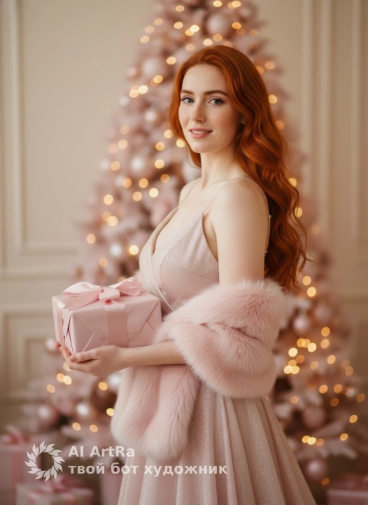 Не меняя внешности женщины с фото, перед нами изящная сцена, наполненная атмосферой нежного праздничного уюта и мягкого света, который обволакивает пространство равномерным теплым сиянием. Женщина в роскошном блестящем вечернем платье нежно-розового оттенка, с тонкими бретелями, которое обтекает контуры ее фигуры, излучая приглушенное сверкание, словно сотканное из мельчайших искр. Легкая, пушистая шубка похожего оттенка свободно ниспадает с её плеч и рук, создавая контраст нежной текстуры меха с гладкой, переливающейся тканью платья. В руках она держит аккуратно упакованный в матовую розовую бумагу подарок, перевязанный атласной лентой с элегантным бантом, что добавляет картине чувство торжественности и ожидания радостного момента. Ее поза спокойна и уверена — она слегка повернута в профиль, но лицо обращено прямо к зрителю, с легкой улыбкой и добрыми глазами, которые выразительно подчёркнуты деликатным макияжем. Волосы крупными волнами ниспадают на одно плечо, создавая эффект мягкости и гармонии, они словно вписываются в общую цветовую гамму окружения. На фоне замысловато украшенной рождественской ёлки пастельно-розового цвета с большим количеством шаров и теплых огоньков, блестящих и переливающихся, создаётся чувство глубины и лёгкости, задний план слегка размыт мягкими бликами, акцентируя внимание на главном герое кадра. Свет падает мягко, без резких теней, наполняя сцену золотистым теплом, что подчёркивает благородство материалов и богатство оттенков, общее настроение – торжественное, в то же время уютное и интимное. Эта композиция словно запечатлевает момент предвкушения праздника, наполненного теплом и ожиданием чудес, где каждая деталь — от платье до подарка — говорит о нежности, заботе и праздничном волшебстве, фотореалистичное изображение, высокая текстурная детализация, высокое качество, разрешение 8K.