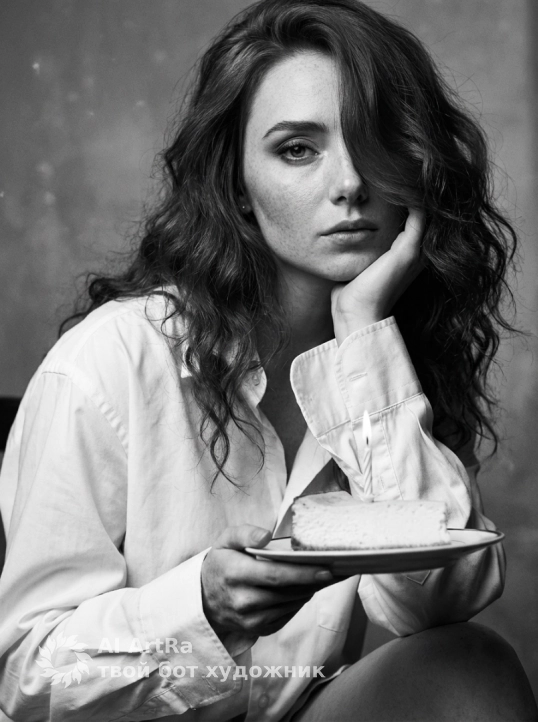 Создай портрет, Не меняя черты лица. , экстремально близкий чёрно-белый кадр с кинематографическим эффектом. Контраст на фото повышен, создавая драматическое освещение и глубокие тени, что подчеркивает выразительные черты лица. Женщина одета в свободную белую мужскую рубашку оверсайз, сидя расслабленно, слегка наклонённая вперёд, с локтями на коленях. Её волосы волнистые создавая мягкие волны, часть из которых закрывает одно из её глаз, добавляя асимметричности и загадочности в композицию.в руке она держит тарелку с кусочком чизкейка , с одной горящей свечкой.