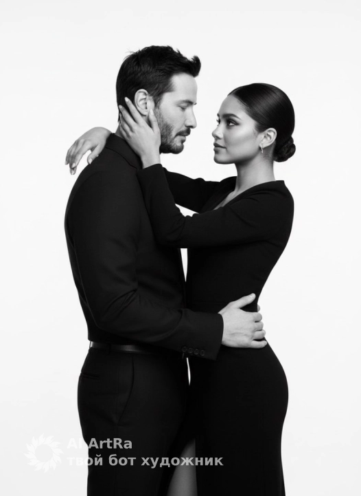 чёрно‑белая фэшн‑съёмка влюбленной пары: женщина с гладко зачёсанными волосами чувственно обнимает мужчину, ладонь на его щеке; чистый белый студийный фон, мягкий студийный свет, естественные тени, средний крупный план, высокая резкость