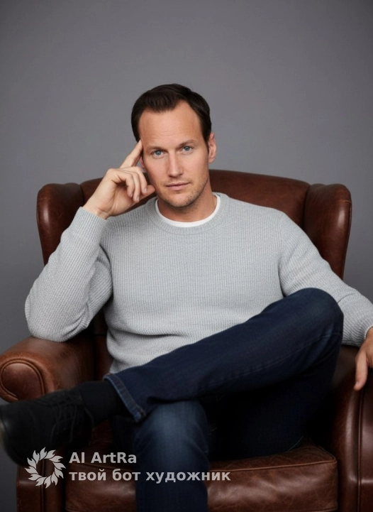 минималистичный мужской портрет, мужчина в фотостудии: модель (лицо максимально без изменений), в сером свитере мелкой вязки поверх белой футболки сидит в коричневом кожаном кресле, ноги скрещены, рука у виска; нейтральный серый фон, мягкий студийный свет, чистая композиция, средний план, высокая резкость