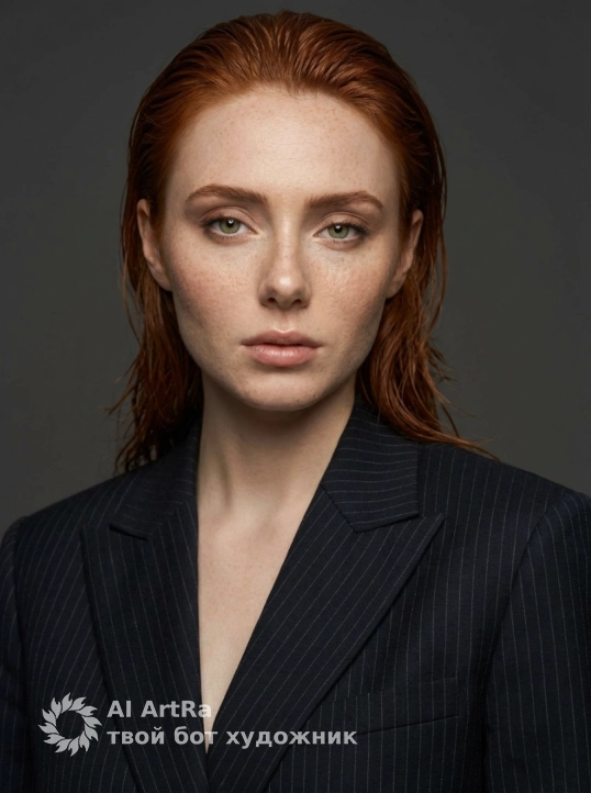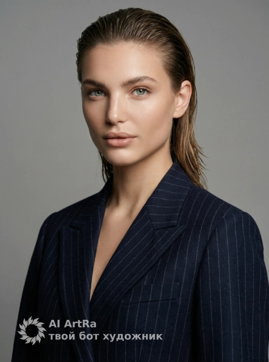 A photo of a woman standing directly in front of the camera, her shoulders and upper chest facing the lens, her head slightly tilted, and her gaze directed at the camera. The shot is chest-high, with the camera positioned at eye level, and the frame is symmetrical and static. The skin is even, with a natural matte finish and clearly defined texture. The makeup is minimalist: light nude eye makeup with soft shadows, defined lashes without excessive volume, and natural nude-pink lips with a slightly dewy effect without overt shine. The hair is slicked back for a wet look, strands combed evenly, and the ends slightly textured. The woman is wearing a dark, classic-cut jacket with thin vertical stripes, slightly flared shoulders, and a V-neck. The fabric is matte and thick, with a clearly visible stripe pattern and the texture of a suiting fabric. The background is a neutral studio wall in a light gray hue, uniform, without texture or additional objects. The lighting is soft and uniform, with the main light positioned in front and slightly above the face, creating smooth transitions of light across the face and body. Shadows are soft, low-contrast, barely noticeable under the chin and along the neckline, without hard edges. The light emphasizes the shape of the face, collarbones, and skin texture, creating a clean, editorial lighting effect. Shot with an 85mm portrait lens, shallow depth of field, focusing on the face and upper body, slightly softened background, highly detailed skin, hair, and fabric, highly detailed, photorealistic.