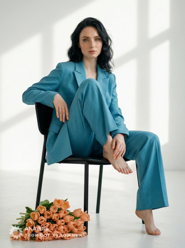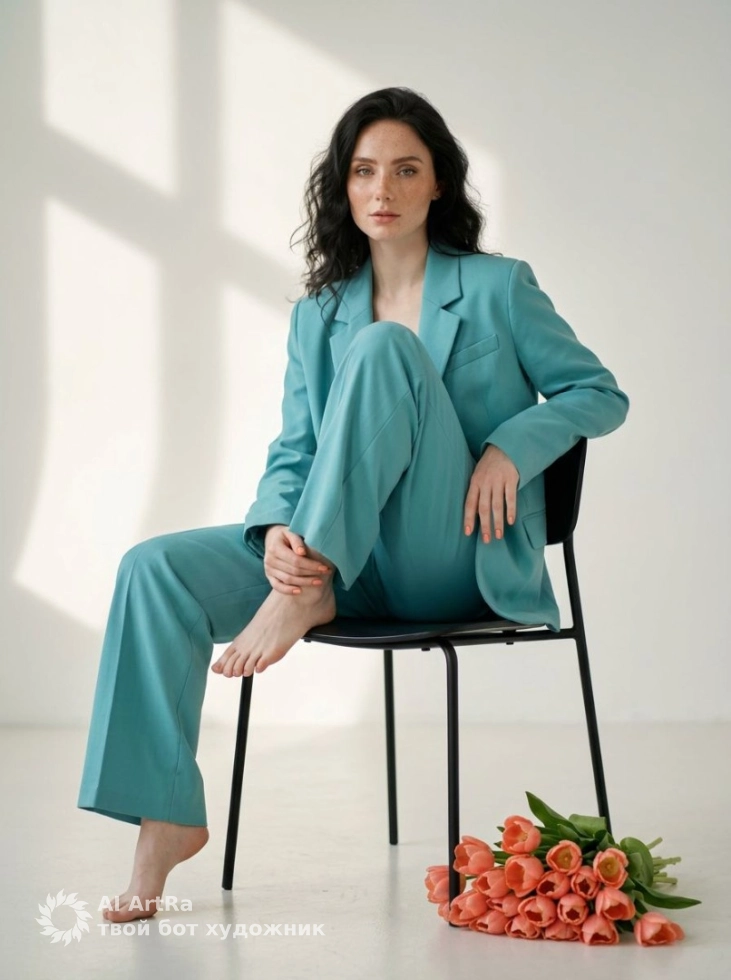 Представьте, как элегантная молодая женщина в бирюзовом оверсайз-костюме, сосредоточенная на том, что она делает, излучает уверенность и профессионализм на фоне мягкого света романтичной студии. Каждое изображение создает атмосферу минимализма и утонченной эстетики, идеально подходящей для тех, кто ценит высокое качество и стиль.