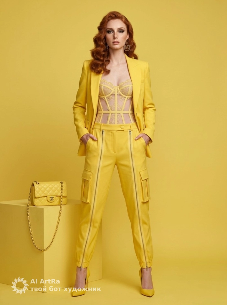 Монохромный шик, женщина в жёлтом образе высокой моды