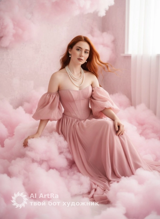 A photograph of a woman in a dreamy cloudscape, wearing a pink off-the-shoulder corset dress with puffed sleeves and a long, flowing, semi-sheer skirt. She sits gracefully, one leg slightly exposed, surrounded by fluffy, pink cloud-like textures. The environment is soft and airy, with pink textured walls and floors reminiscent of pink clouds. The lighting is soft, diffused, and bright, creating a dreamy effect. The woman is angled slightly to the side, looking into the camera. The makeup is elegant: defined eyes, neutral lip colors, and subtle contouring. She wears a layered pearl necklace and earrings. Skin texture should appear natural and realistic, and hands should be anatomically correct.