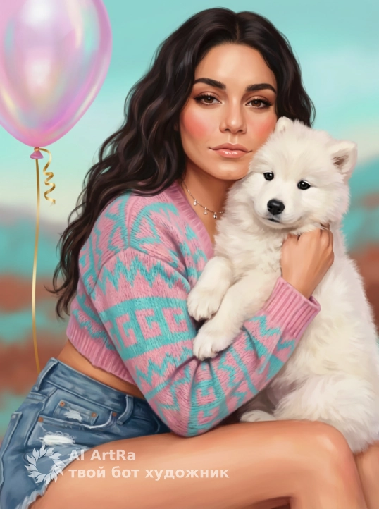 Используйте внешний вид пользователя, референса 1:1 — лицо, кожу, волосы и тело без каких-либо изменений, с едва заметным румянцем на щеках и натуральным блеском губ, без яркого макияжа, с аккуратным маникюром нейтрального оттенка, на шее — тонкая цепочка с мелкими подвесками, в руках — пушистый белый щенок с черными глазами и носом, обнимаемый с нежностью, на фоне — размытый пастельный пейзаж с оттенками бирюзы и ржавчины, слева — розовый гелиевый шар с иризацией и золотистой лентой, освещение мягкое, рассеянное, с теплыми бликами на коже и шерсти, стиль — цифровая живопись с фотореалистичной текстурой, композиция — средний план, ракурс с легким подъемом камеры, объект расположен центрально, взгляд направлен прямо на зрителя, атмосфера — нежная, мечтательная, с легкой ностальгией, одежда — укороченный вязаный свитер с геометрическим узором в розово-бирюзовой гамме и джинсовые шорты с потертостями, поза — стоящая, слегка наклоненная вперед, с обниманием питомца, масштаб кадра — от пояса до макушки, с акцентом на лицо и животное.