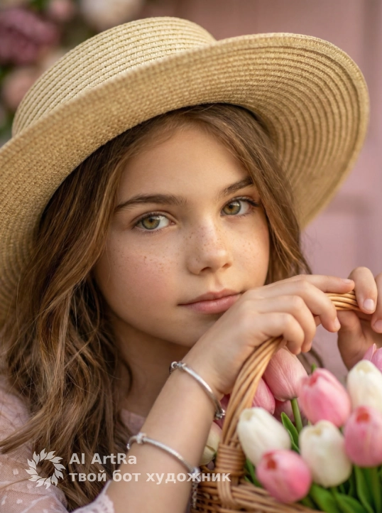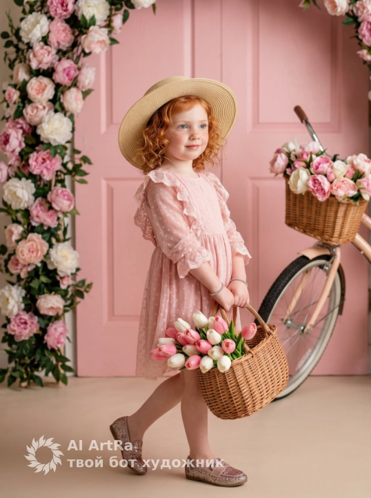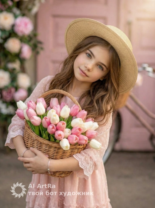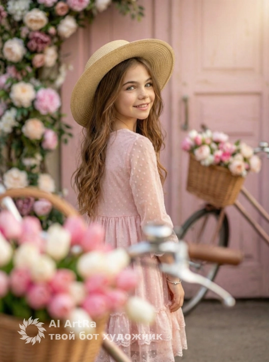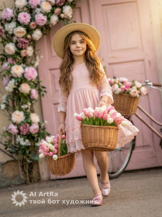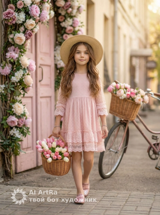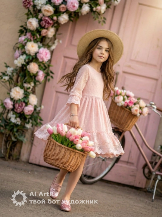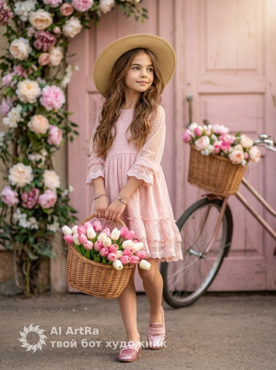 Используйте внешний вид пользователя, референса 1:1 — лицо, кожу, волосы и тело без каких-либо изменений. Девочка в нежном пастельно-розовом платье с полупрозрачными рукавами и мелким горохом, украшенном кружевными оборками, держит в руках плетёную корзину с розово-белыми тюльпанами; на голове — соломенная шляпка с широкими полями, на ногах — блестящие туфли-лоферы с глиттером; макияж едва заметный — акцент на румянах и естественном блеске губ; ногти короткие, ухоженные, без лака; на запястьях — тонкие браслеты; поза — лёгкий шаг вперёд, взгляд направлен в сторону, слегка улыбаясь; фон — розовая деревянная дверь с велосипедом в корзине с цветами, слева — цветочная арка с пионами; освещение мягкое, рассеянное, с теплыми тонами, создающее атмосферу нежной весенней мечтательности; стиль — высокий реализм, цифровая фотография с художественной обработкой, глубина резкости мягкая, фокус на фигуре девочки; ракурс — средний план, с лёгким ракурсом снизу, камера на уровне пояса; композиция — центральная, с акцентом на корзину и лицо; настроение — нежное, романтичное, с детской невинностью и весенней свежестью.