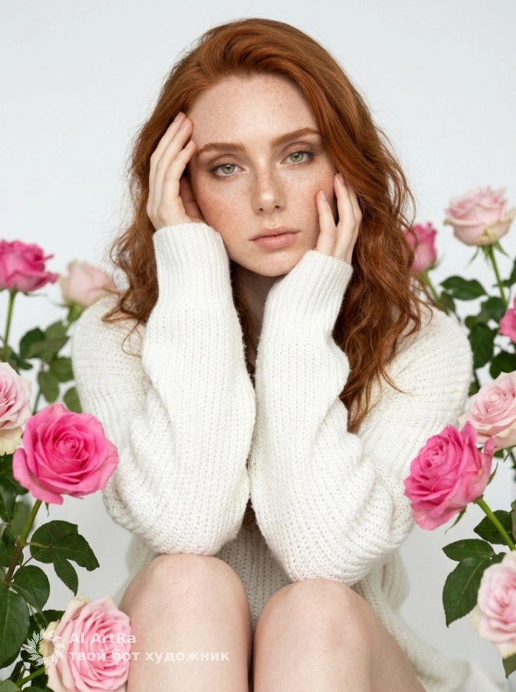 Фотография, наполненная мягким светом и теплым настроением, создаёт эффект близости и доверия. Женственный образ в крупно вязаном белом свитере в окружении цветов придаёт кадру уникальность и изящность. Вы можете адаптировать промпт под свои пожелания, чтобы получить именно тот результат, который вы ищете. Будь то акцент на вашем стиле, настроении или любимых цветах — мы готовы вам помочь!