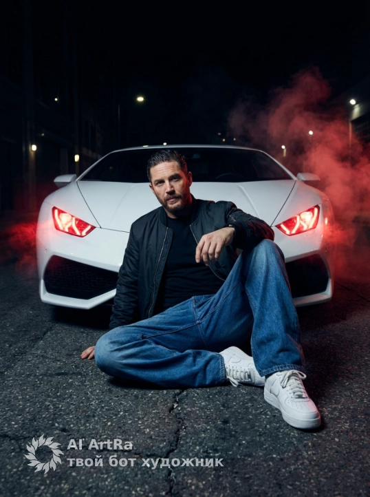 Референс-фото мужчины прикреплено, использовать его как основу внешности и не менять черты лица; создать фотосъемку на улице: мужчина сидит на асфальте в дерзкой позе, одну ногу согнул в колене и упирается на неё руками, на фоне белого спортивного автомобиля в темное время суток; он одет в черную футболку, голубые свободные джинсы багги и бомбер, на ногах белые кеды; фон фотографии темный, с неярким освещением, что придает снимку атмосферу загадочности и элегантности; вся сцена выглядит очень стильной и драматичной, с фокусом на контрасте между светлым автомобилем и темным окружением; красные фары горят, сзади дым с легким красным оттенком, ракурс