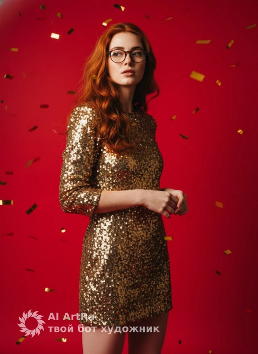 студийный женский портрет: девушка в мини-платье с золотыми пайетками на красном фоне циклораме, внешность максимально без изменений, вокруг летит много золотого конфетти; кинематографический боковой свет, насыщенные тёплые тона, высокий контраст, высокая детализация, атмосфера новогоднего праздника