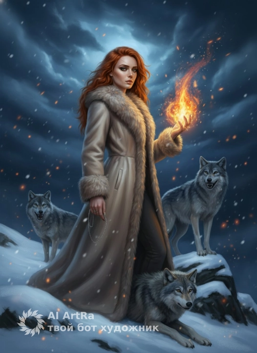 Используйте внешний вид пользователя, референса 1:1 — лицо, кожу, волосы и тело без каких-либо изменений, с акцентом на драматичный макияж: тёмные, дымчатые тени на веках, чётко очерченные брови, глянцевые, насыщенно-тёплые губы, слегка подсвеченные бликом; маникюр отсутствует, ногти естественной длины, без покрытия; украшений нет, за исключением тонкой цепочки или шнура, держимого в левой руке; главный объект — женщина в позе полупрофиля, стоящая на снежном склоне, смотрящая в сторону зрителя, её правая ладонь поднята и источает яркий, пылающий огонь, вокруг которого витают искры и снежинки; рядом с ней — три волка: один стоит на скале справа, второй лежит внизу, третий вдали слева, все с оскаленными пастью и внимательным взглядом; художественный стиль — цифровая живопись с элементами фэнтези, мягкие переходы, текстурированные поверхности, высокая детализация шерсти, ткани и пламени; фон — ночное небо с бурными облаками, падающим снегом и светящимися огненными частицами, создающими магическую ауру; освещение — контрастное, с теплым светом от огня, отбрасывающим блики на лицо, одежду и снег, холодный синеватый тон фона усиливает драматизм; камера — средний план, слегка снизу, ракурс подчеркивает величие фигуры и волков, композиция смещена влево, оставляя пространство для неба и огня; масштаб кадра — полный рост женщины с волками в кадре, с акцентом на верхнюю часть тела и огонь; атмосфера — мистическая, напряжённая, волшебная, с ощущением силы и одиночества; одежда — длинное пальто светло-бежевого оттенка с меховым воротником и манжетами, застёжками-кнопками, снег слегка оседает на ткани; поза — уверенная, слегка наклонённая вперёд, правая рука вытянута вверх, левая опущена, держит цепочку, взгляд пронзительный, сосредоточенный.