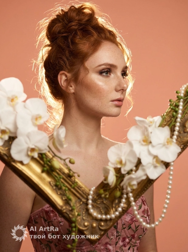 Орхидеи и золото: женщина в розовом корсете внутри рамы