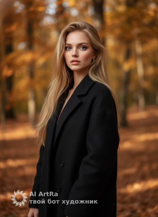 woman, autumn, forest park, hyperrealistic, warm, black coat, looking to camera, blurred fall leaves, outdoors, soft light, detailed texture, focus on woman, moody, portrait, calm, contemplative, natural light, detailed clothing, rich colors, soft focus background